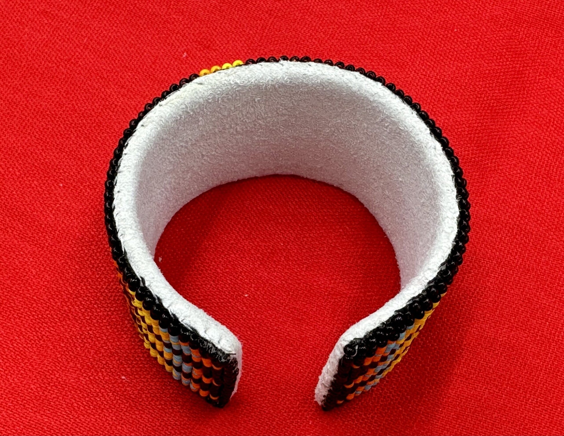 This stunning handmade Black Orange gold Fire color Bear Paw pattern Seed Bead Bracelet is a true work of art. It is crafted using small 11/0 Czech seed beads, suede leather with aluminum inside, and features a hard cuff design. The beautiful bear paw pattern adds a touch of nature-inspired charm to this unique jewelry piece. With a weight of 42.0 grams, a length of 6 inches, and a max width of 1.4 inches, this bracelet is the perfect accessory to add a pop of color and style to any outfit. Complete the look with the matching bear paw necklace set (s-53-sb-1 and s-53-sb-5).