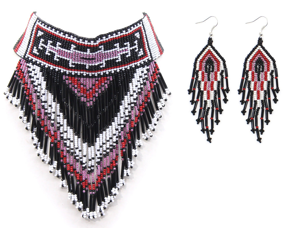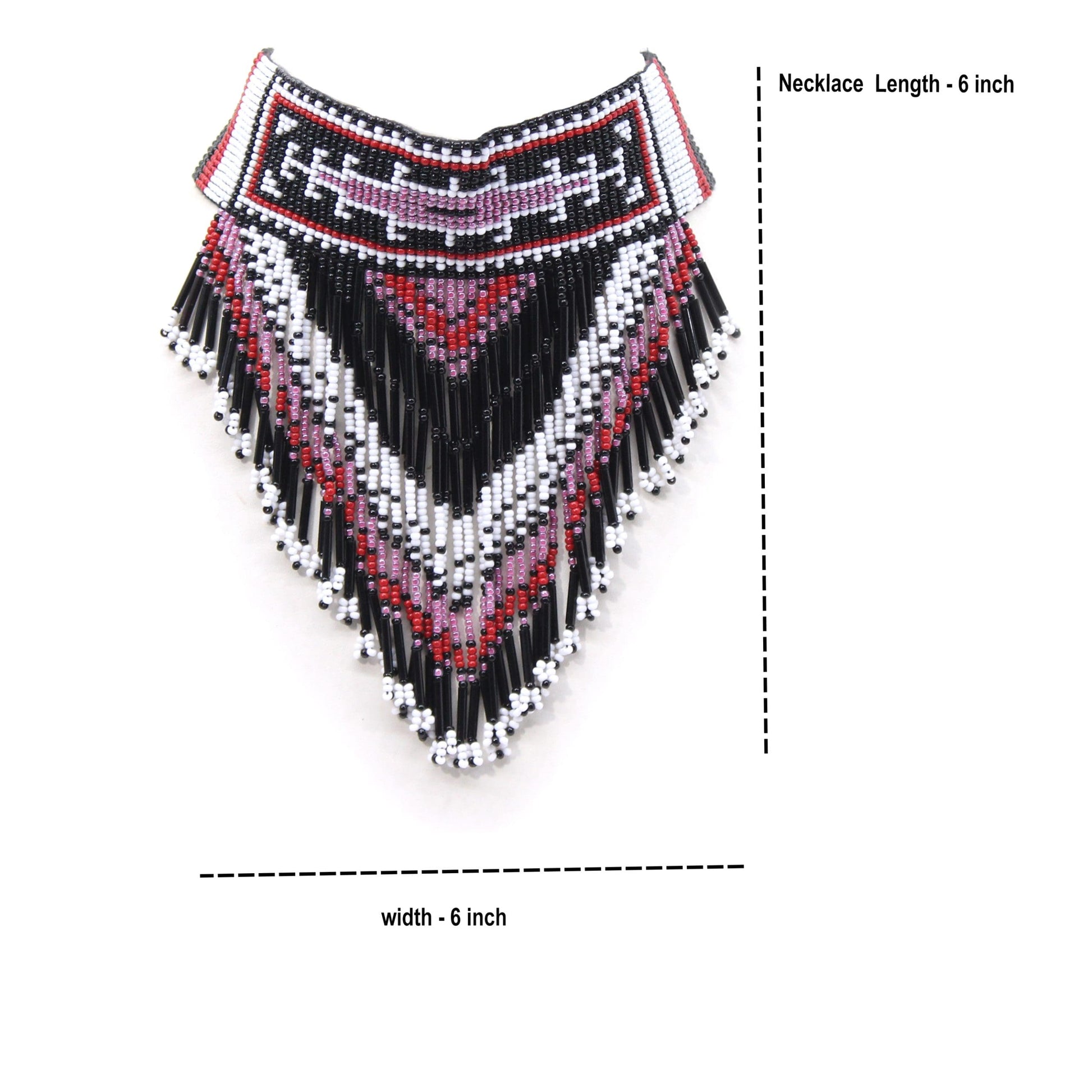 Black Pink Seed Beaded Bib Necklace Earrings Set