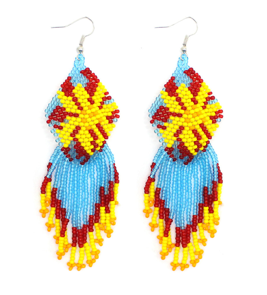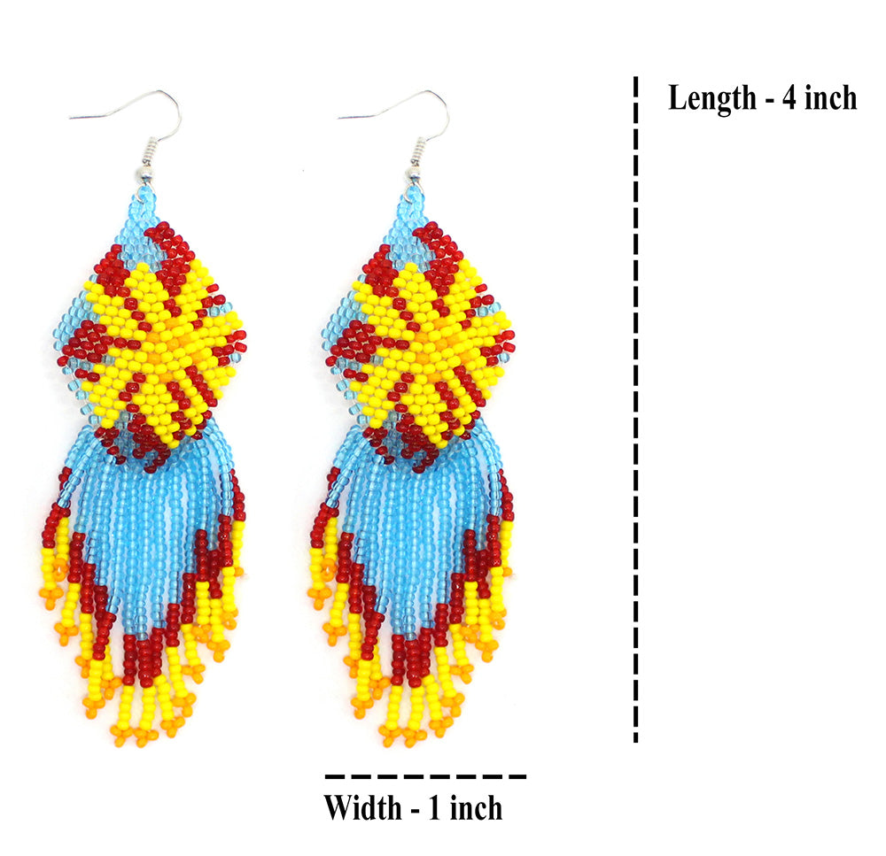 Handmade Cyan Blue Yellow Beaded Flower Pattern Hook Earrings