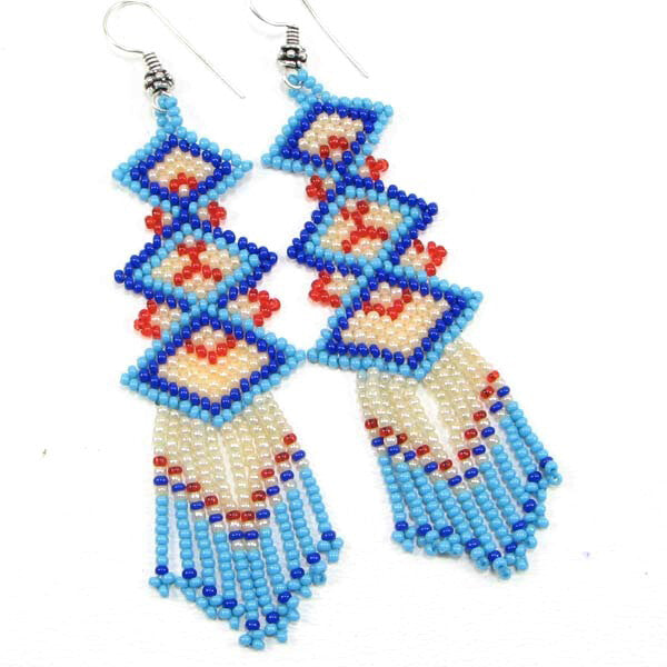 Elevate your outfit with these stunning Blue Red Cream Beads Geometric Design Earrings. Handmade with Czech beads, these fringe earrings are lightweight and eye-catching. Perfect for adding a pop of color to any look.