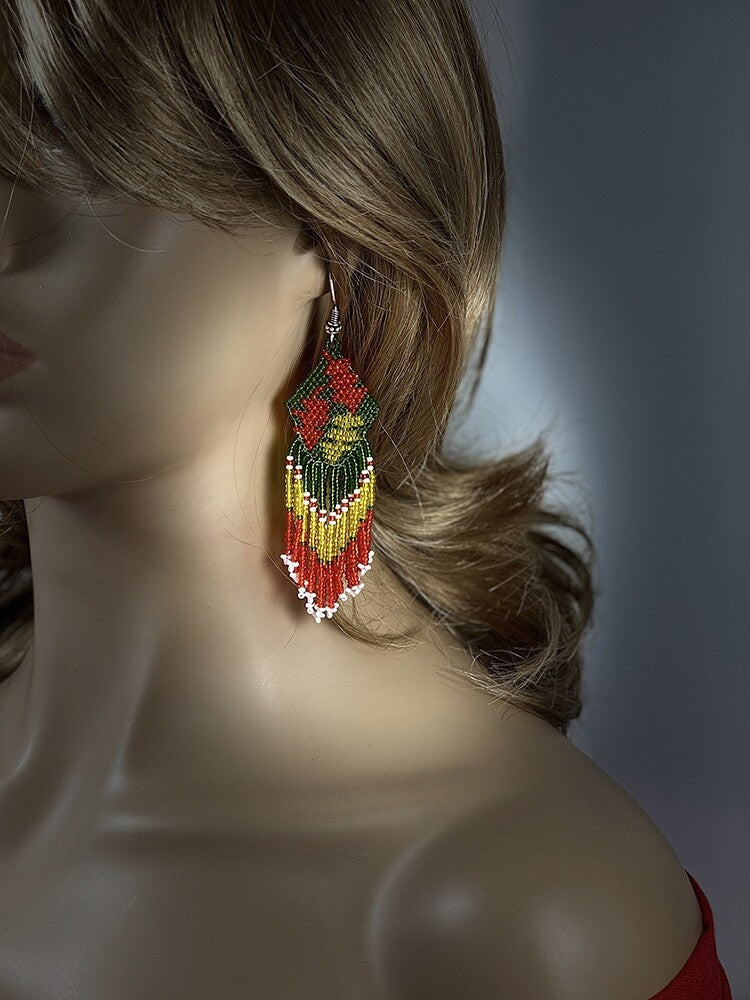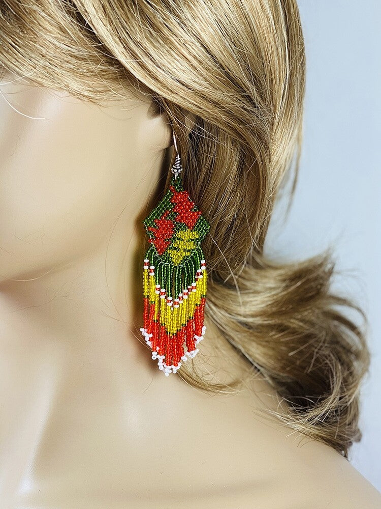 These stunning handmade beaded earrings are a vibrant celebration of color and craftsmanship. Featuring intricate beadwork in rich green, red, yellow, and white Czech glass beads, they create a bold yet elegant statement. The cascading fringe design adds graceful movement, making them perfect for both casual and festive occasions.