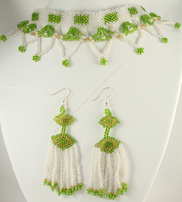 Handmade Beaded Choker Necklace and Earrings Set with Clear White and Green Czech Beads