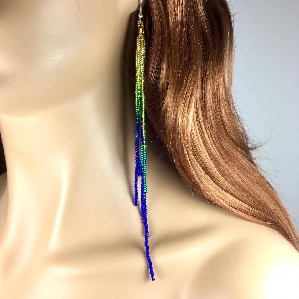 Handcrafted Beaded Green Blue Extra Long Earrings