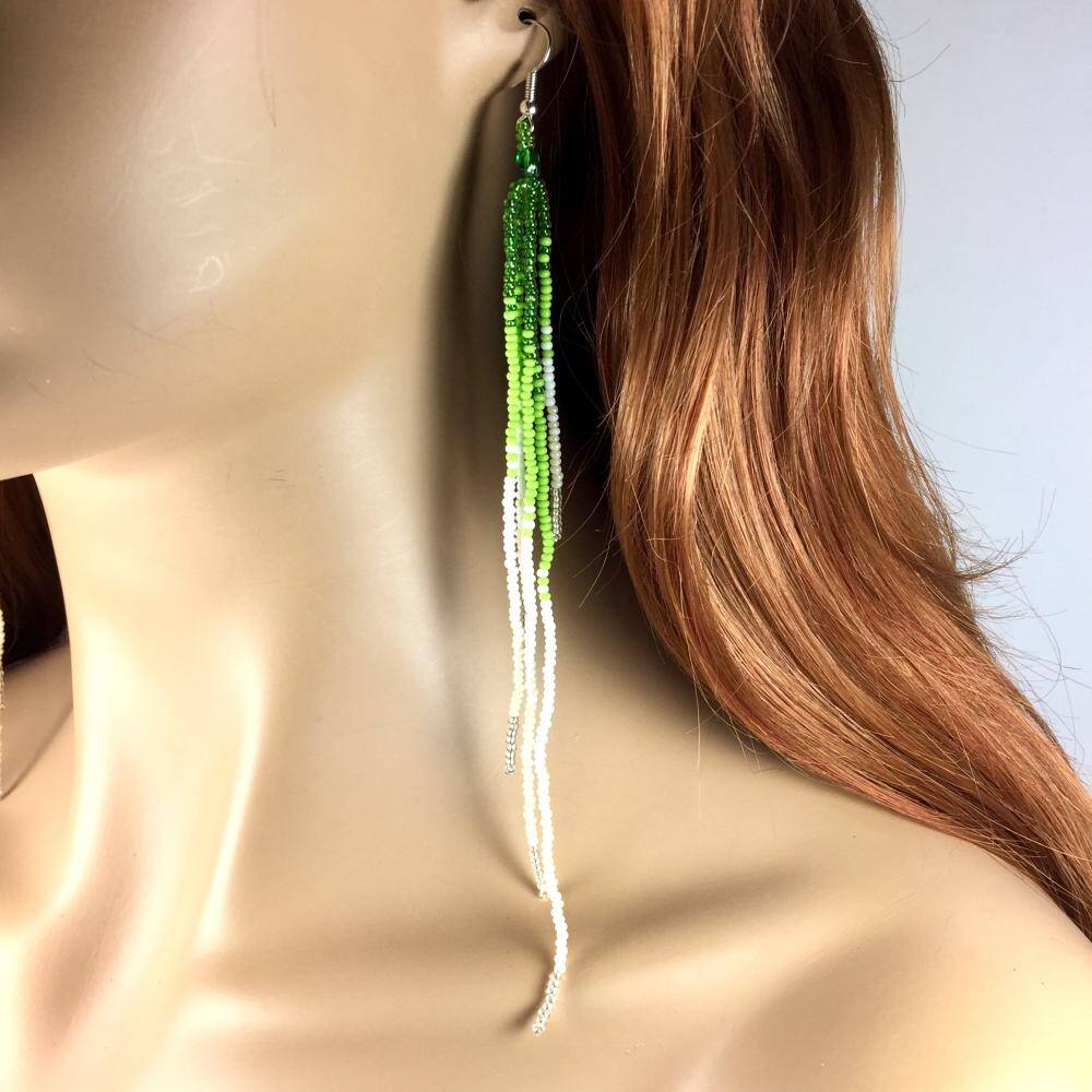 Handcrafted Beaded Green Cream Extra Long Earrings
