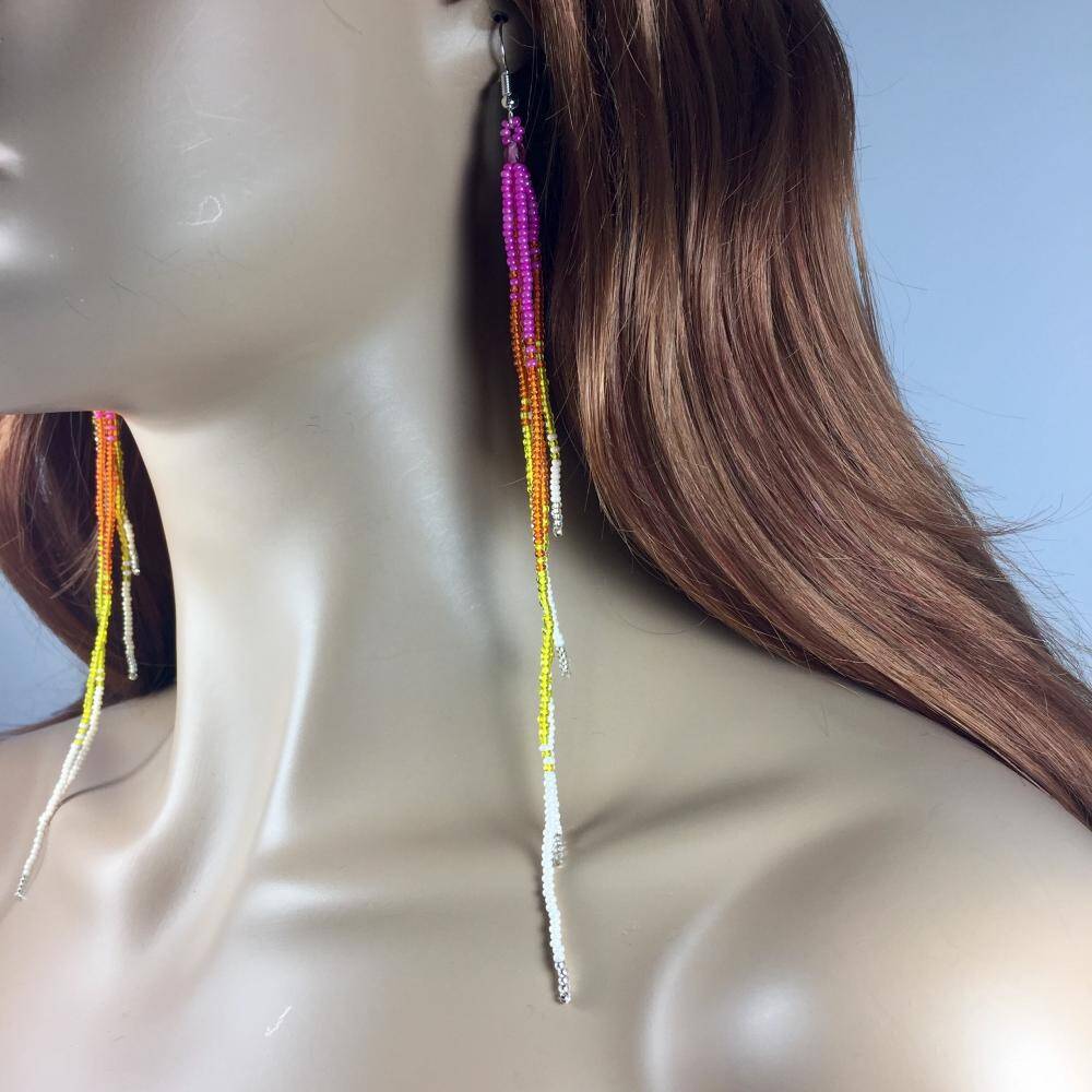 Handcrafted Beaded Pink Orange Yellow Extra Long Earrings