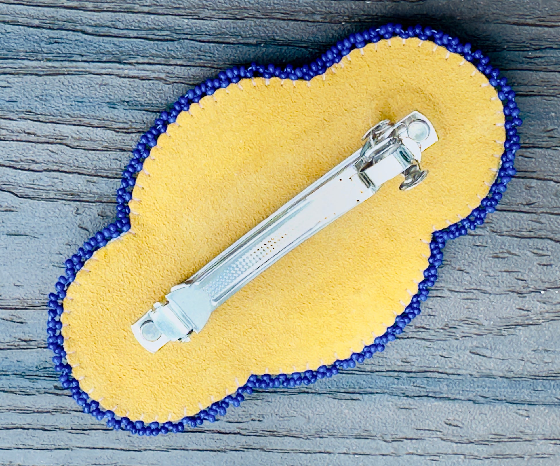 A stunning handmade beaded barrette crafted with high-quality Czech seed beads in vibrant shades of yellow, purple, black, and blue. The intricate starburst pattern creates a bold and elegant statement, perfect for adding a touch of color and craftsmanship to any hairstyle. The back is finished with soft suede leather and fitted with a sturdy French clip made of steel for secure wear.