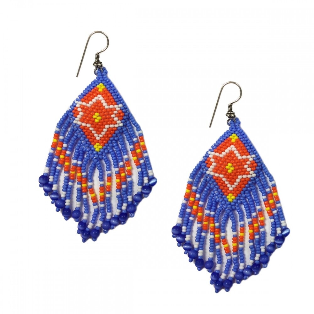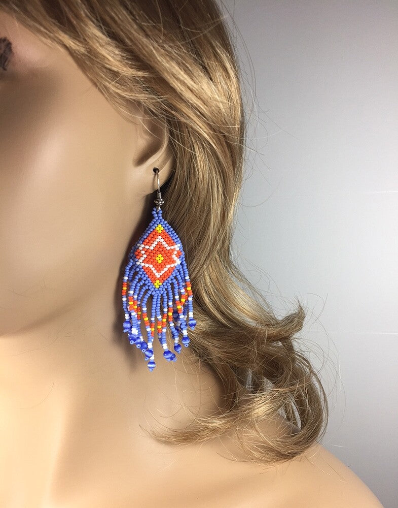 Handmade Blue Orange Beaded Fringe Earrings