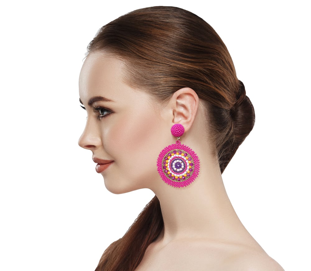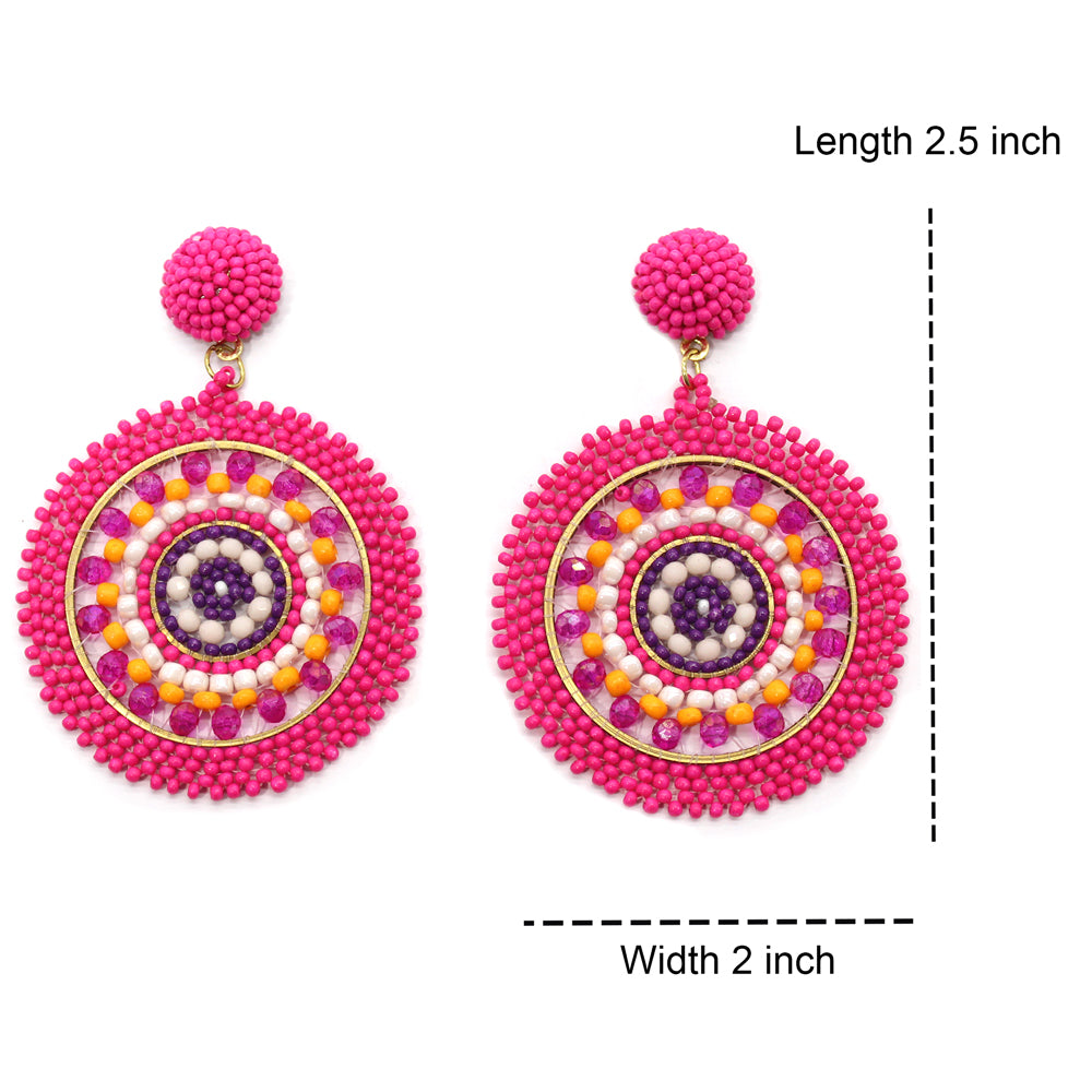 Handmade Beaded Bright Neon Colorful Post Round Earrings for Women Girl All Season (Fuschia)