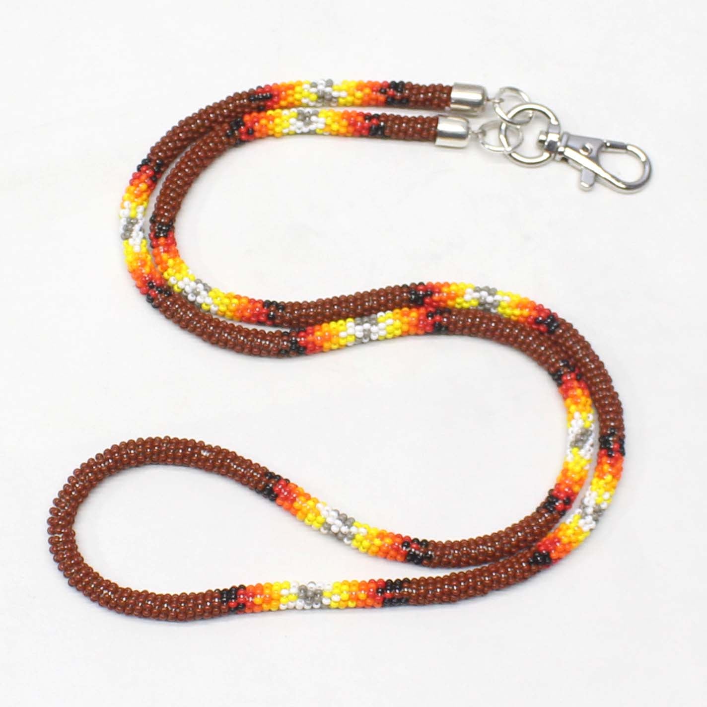 This is a handmade beaded native style lanyard crafted with premium Czech glass beads in size 11/0, featuring a Brown base accented with fiery shades of red, orange, yellow, black and white. The lanyard is 17 inches long.