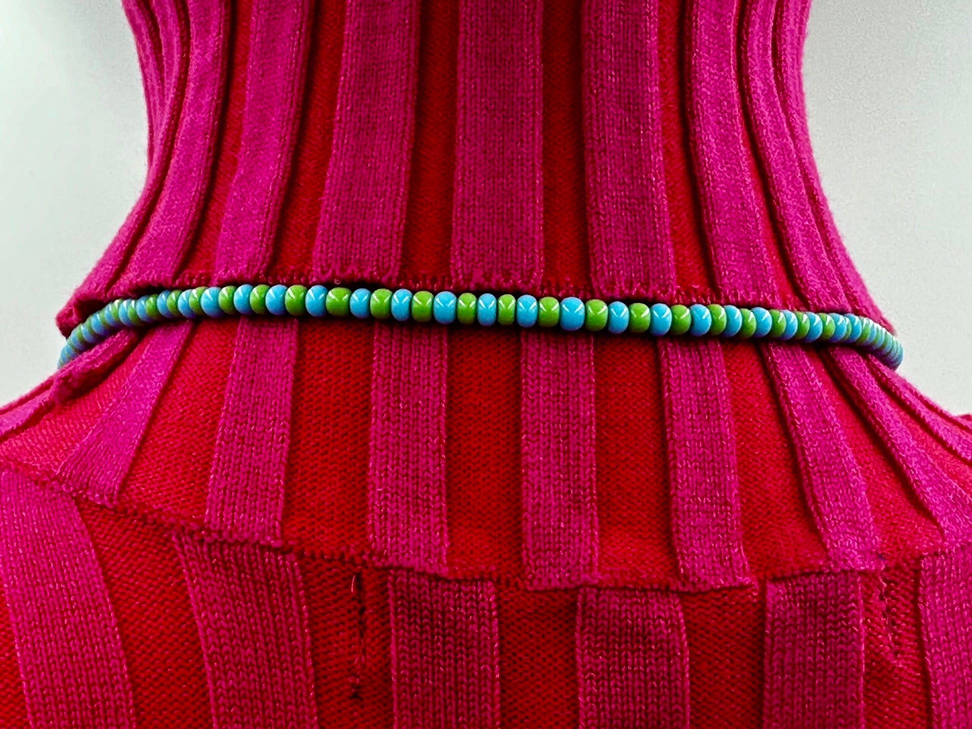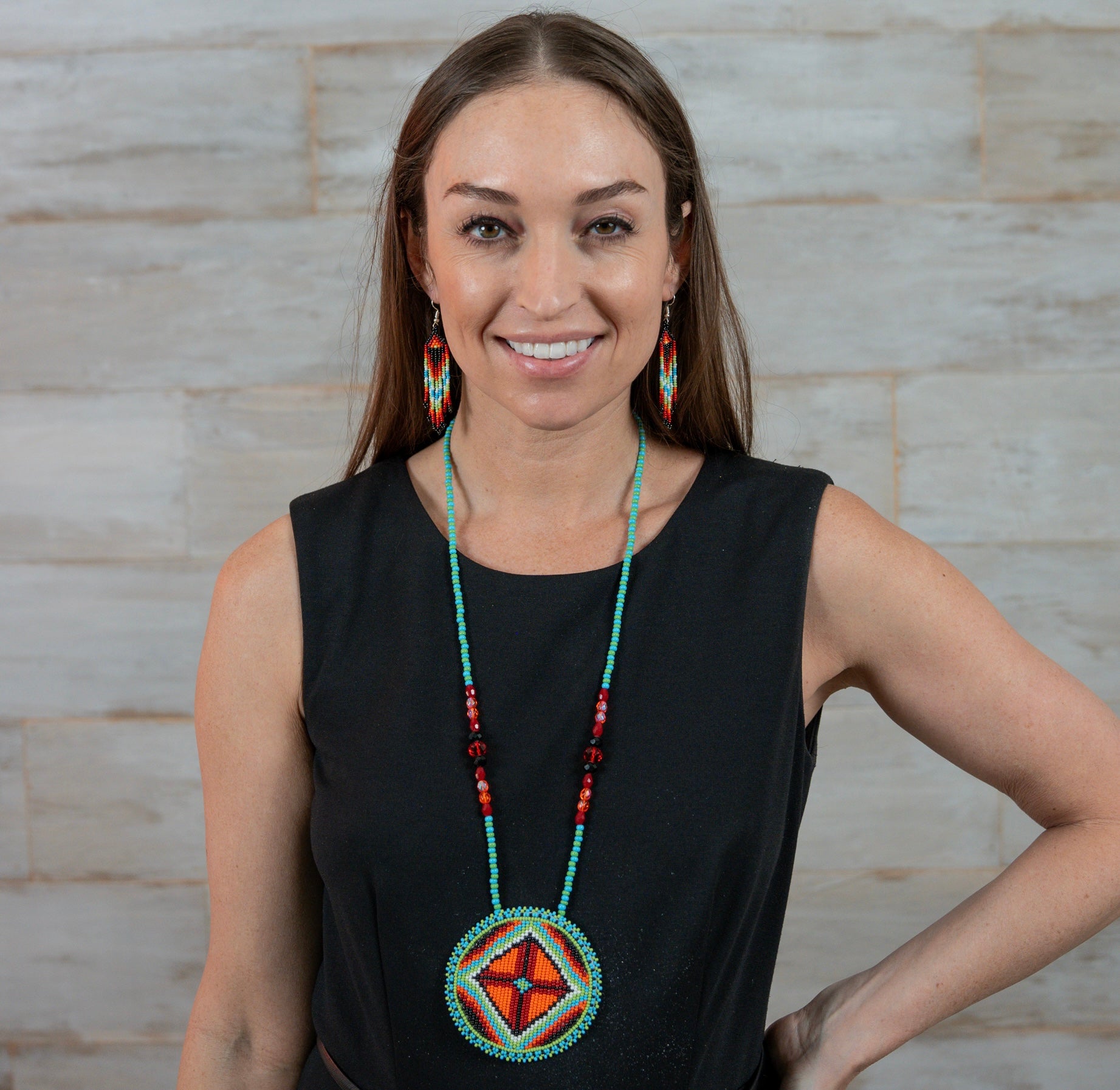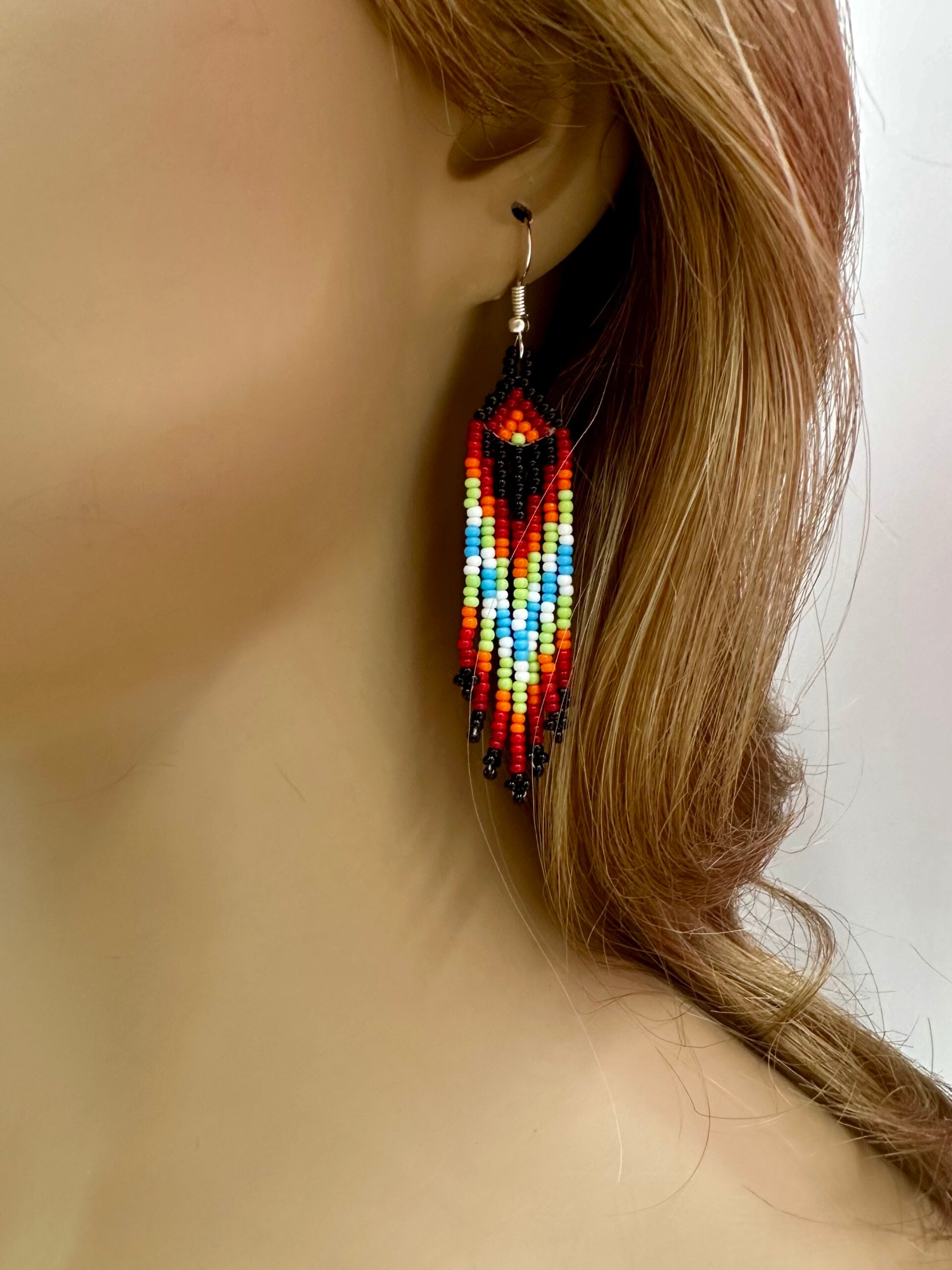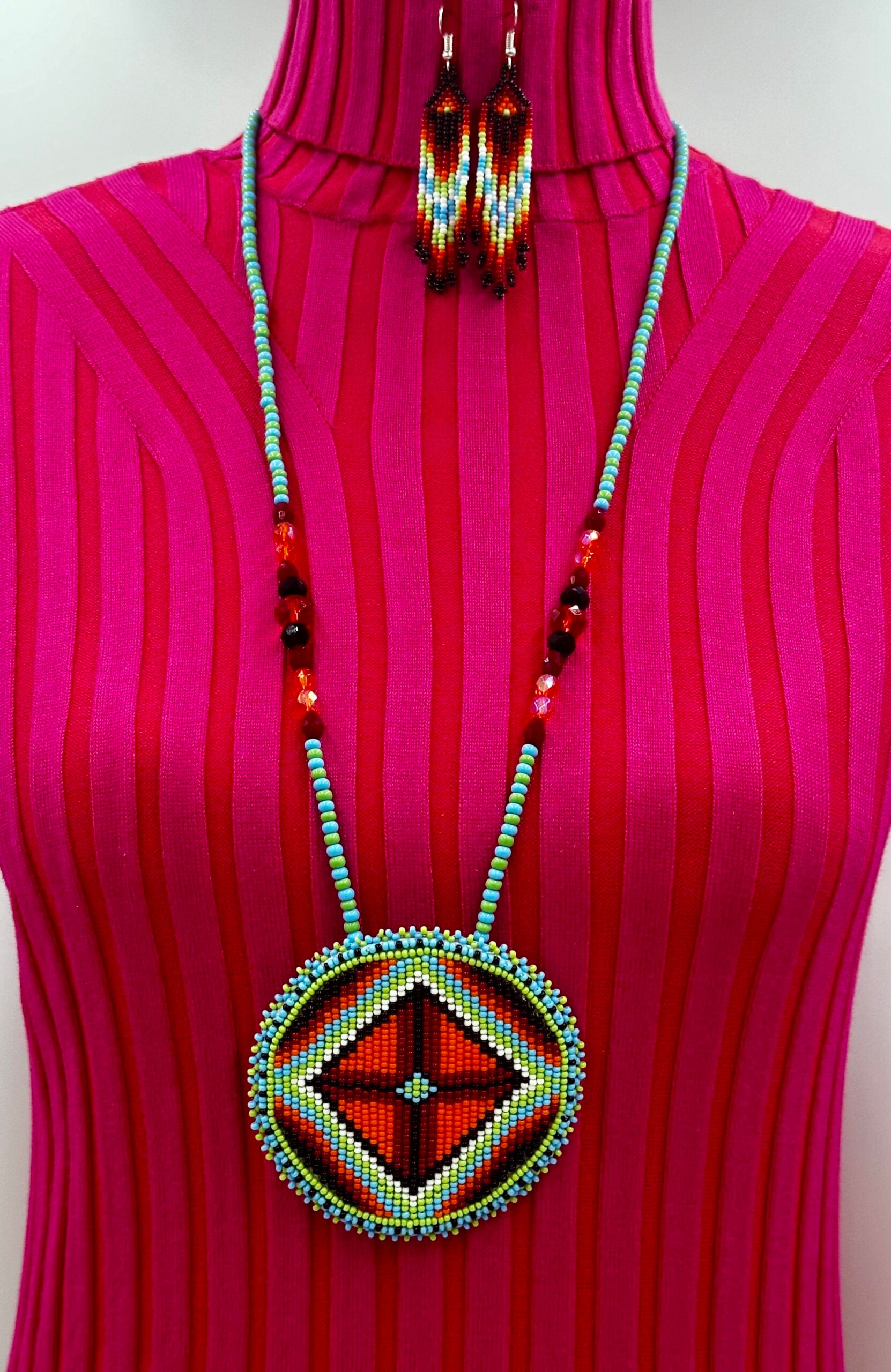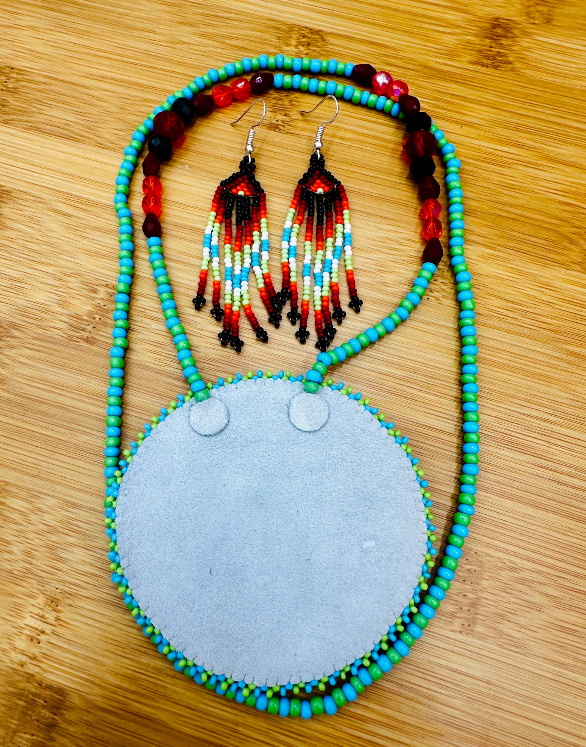 This exquisite handmade beaded jewelry set, crafted in a native-inspired style, showcases the artistry of beadwork using Premium Czech beads in size 11/0. The vibrant color palette features a harmonious blend of light green, cyan blue, orange, and maroon, creating a striking visual appeal.