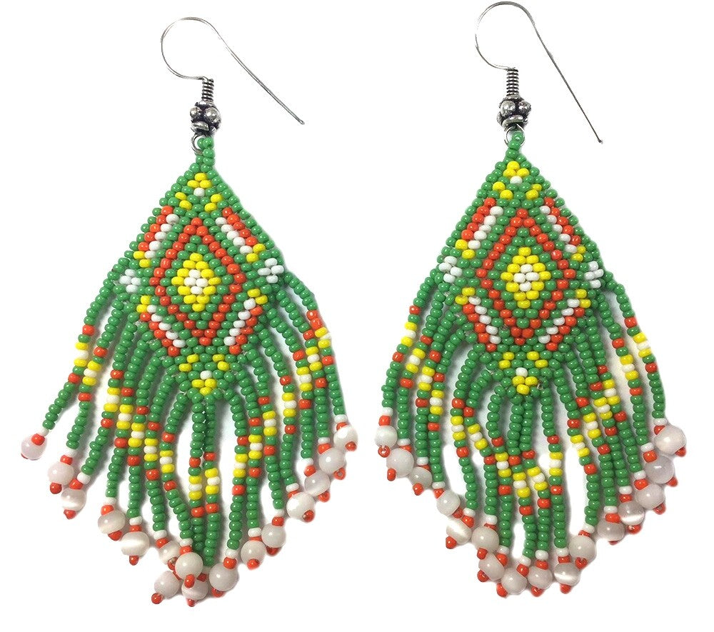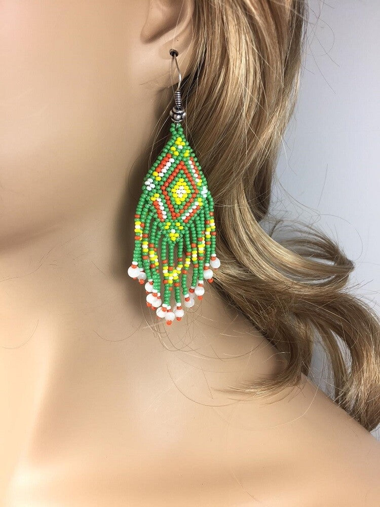 Vibrant Green & Multicolor Beaded Fringe Earrings
