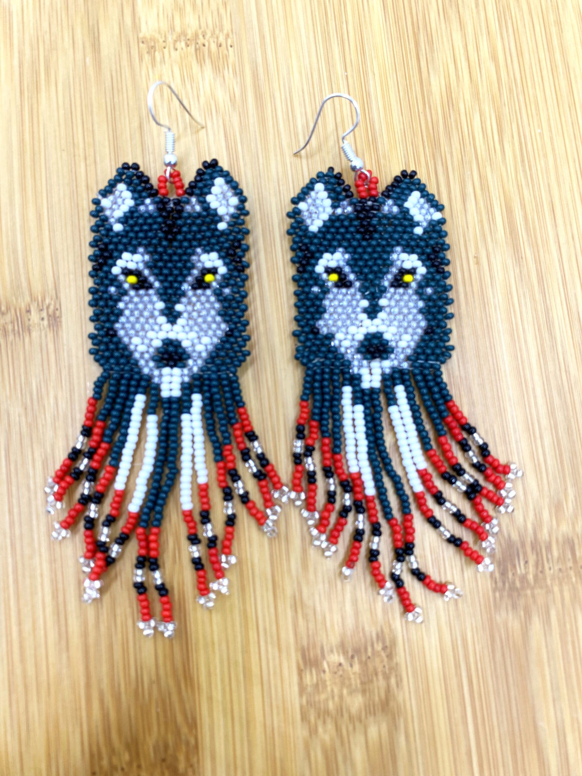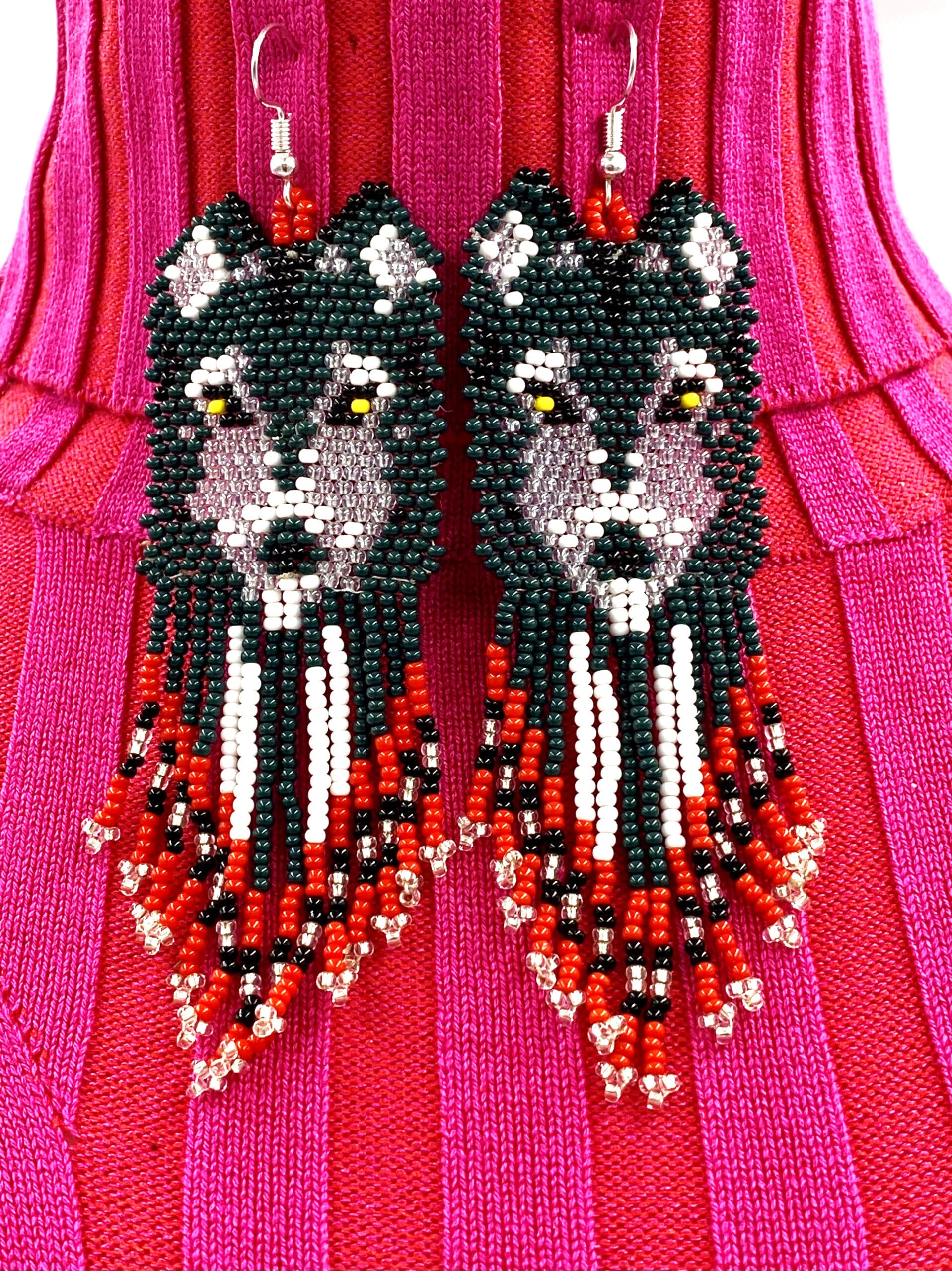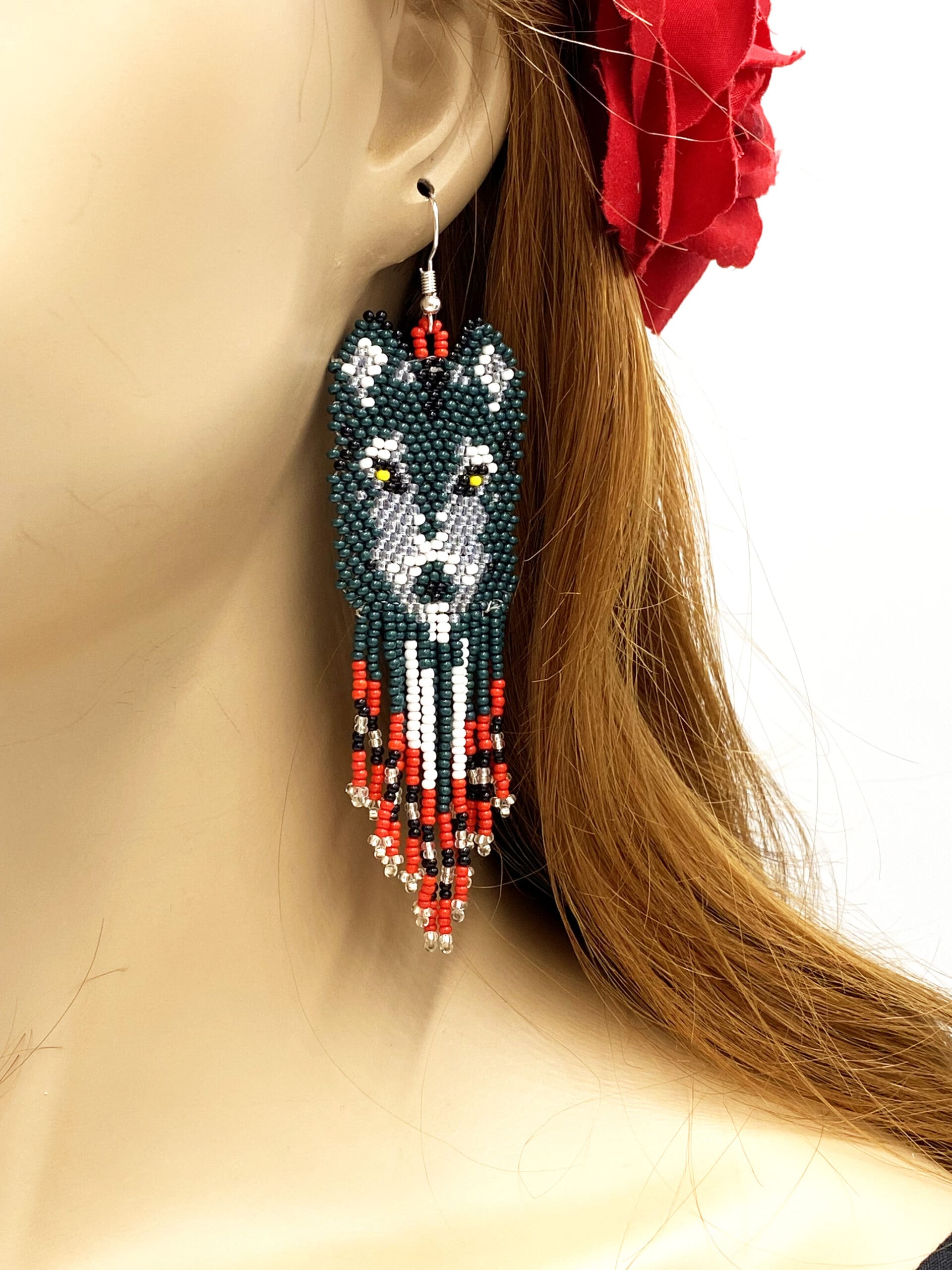 These Wolf Pattern statement earrings are handmade using small 11/0 Czech seed beads and have green, red and white hue accents for an astonishing look. Adorn these ethnic stunners made with love and glorious brilliance that will suit any fashion lover's style.