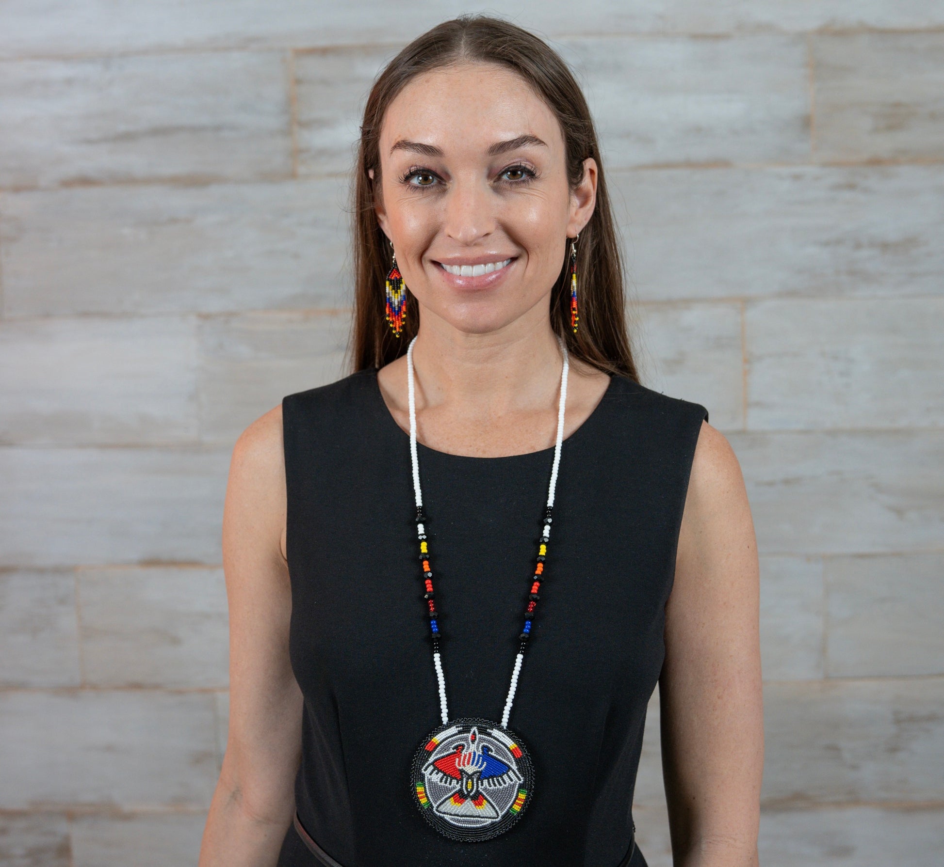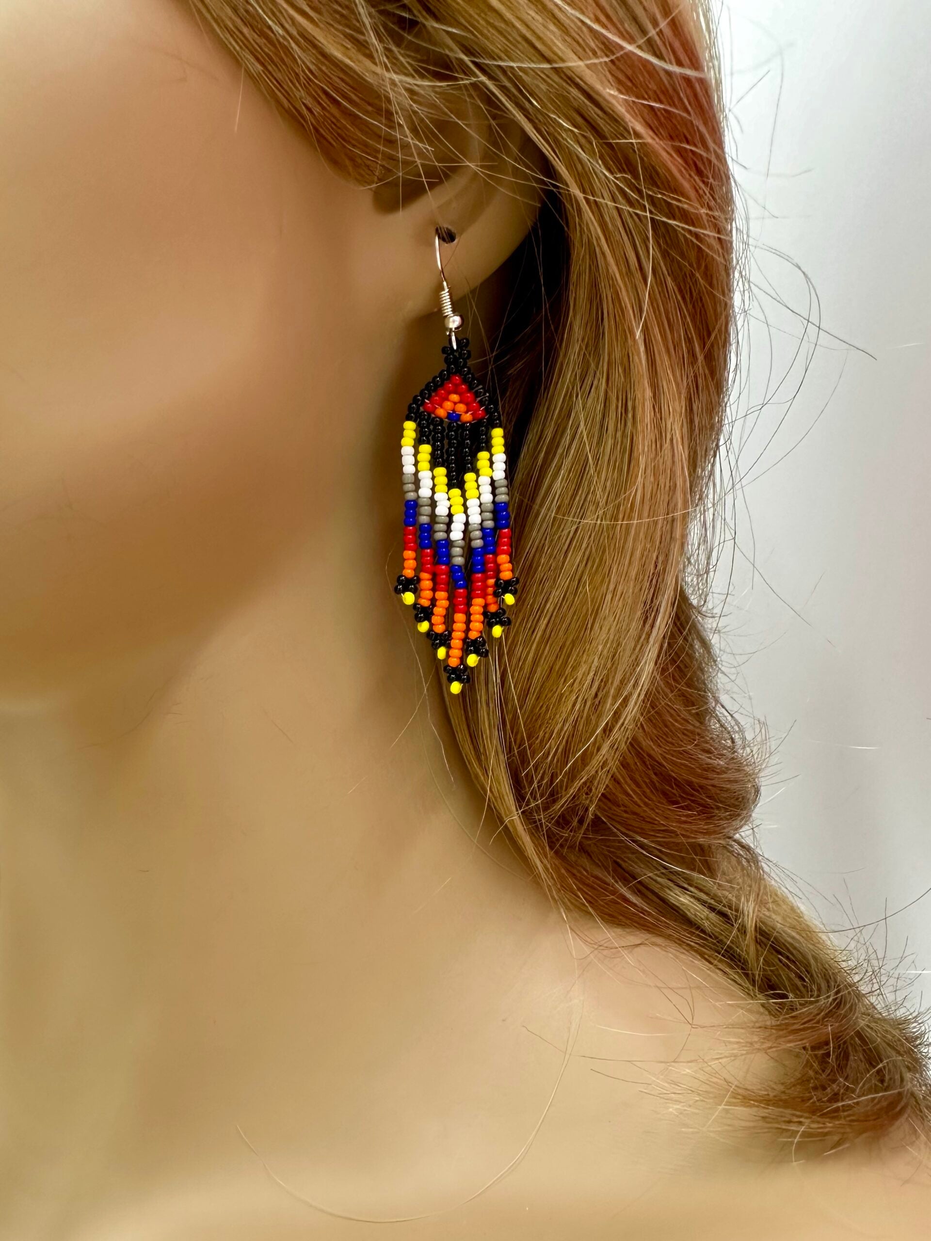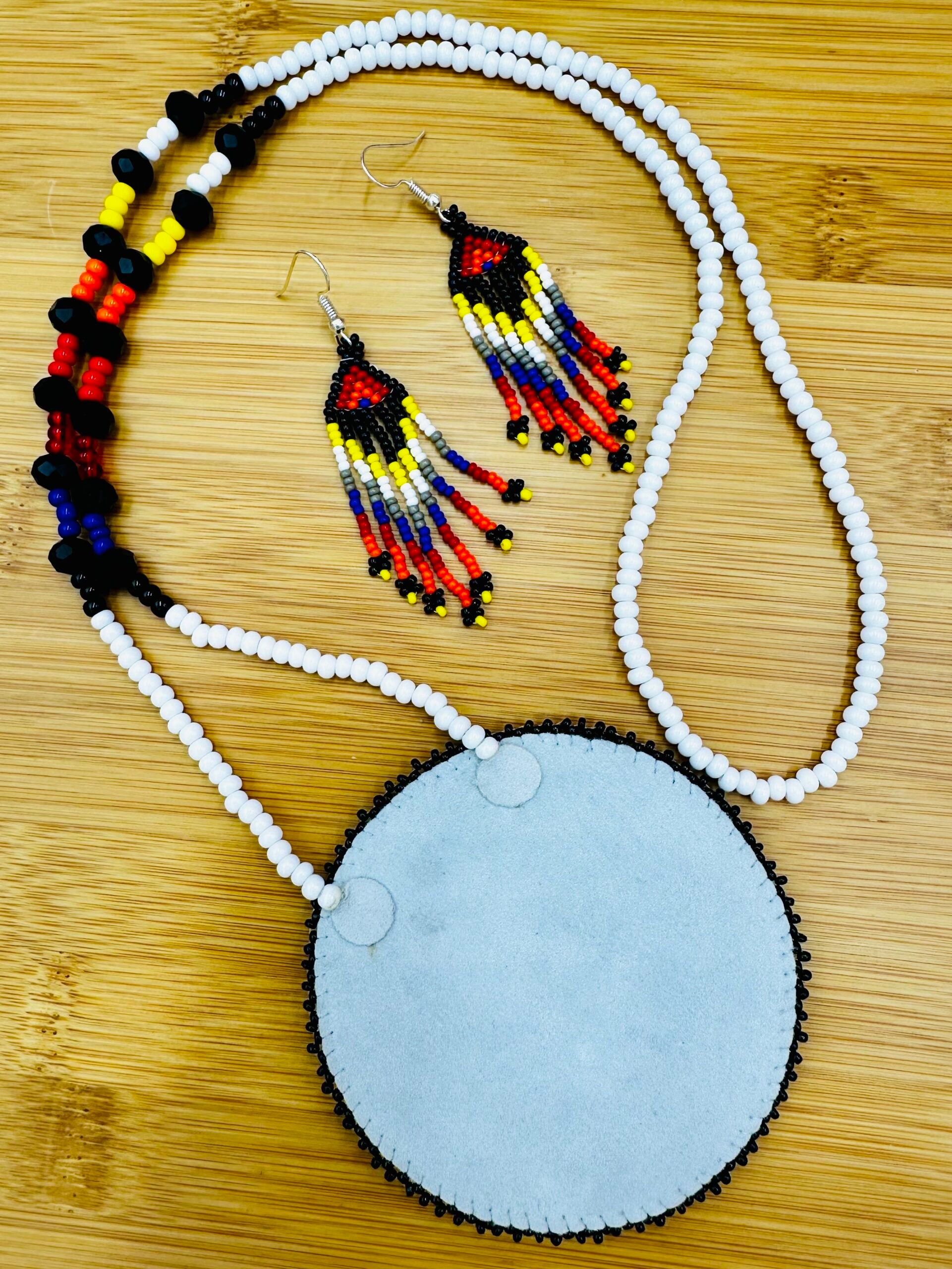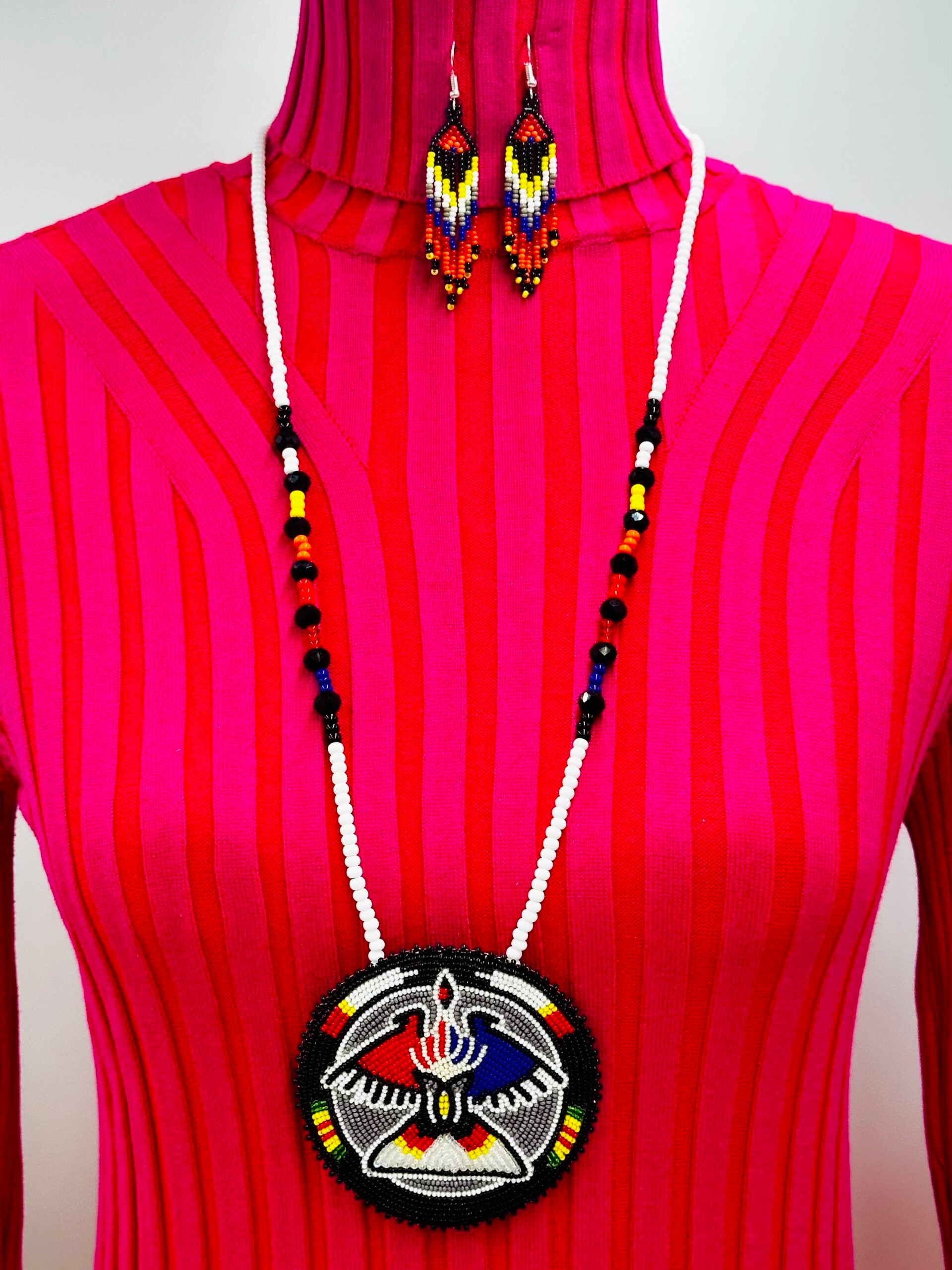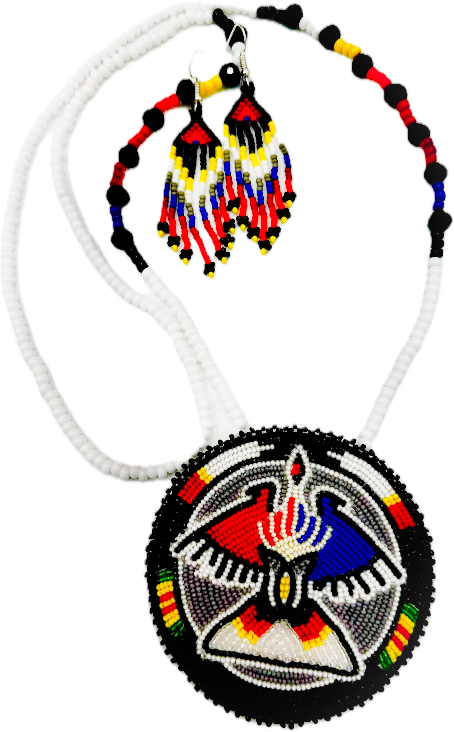Complementing the necklace are matching hook earrings, 3 inches long and 0.5 inches wide, echoing the intricate beadwork and color scheme of the necklace. This set is a perfect fusion of traditional craftsmanship and modern elegance, ideal for making a bold statement.