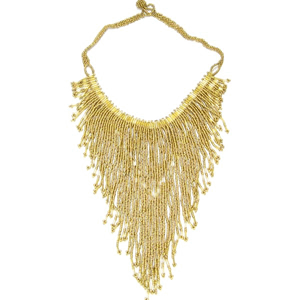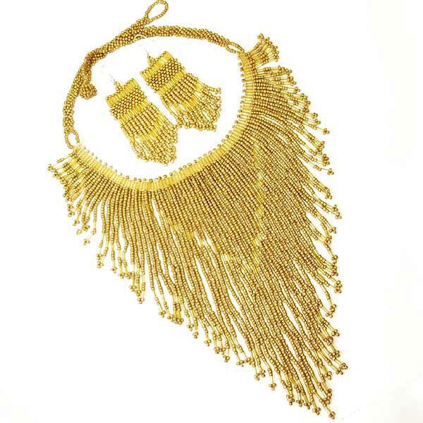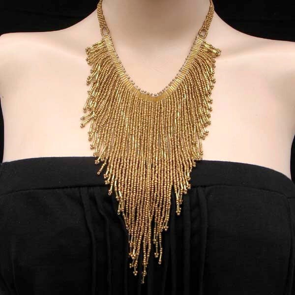 Handmade Beaded Matte Gold Color Bugle Seed Bead Bib Necklace