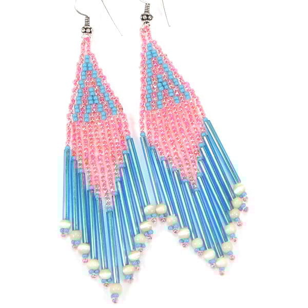 Handmade Beaded Pink Blue Bugle Seed Bead Big Earrings