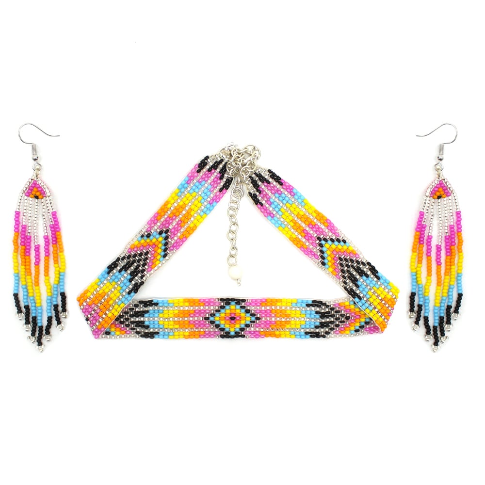 Vibrant Pink, Orange & Yellow Beaded Choker Necklace & Earrings Set