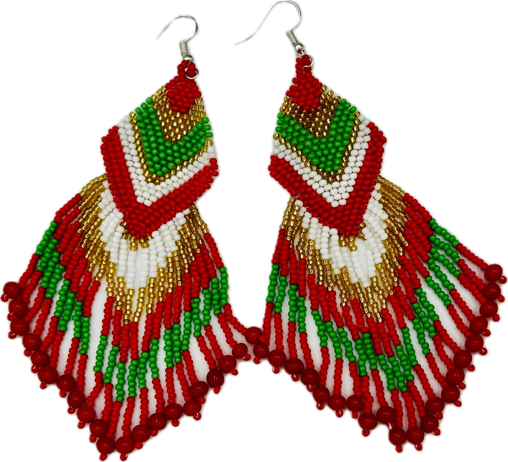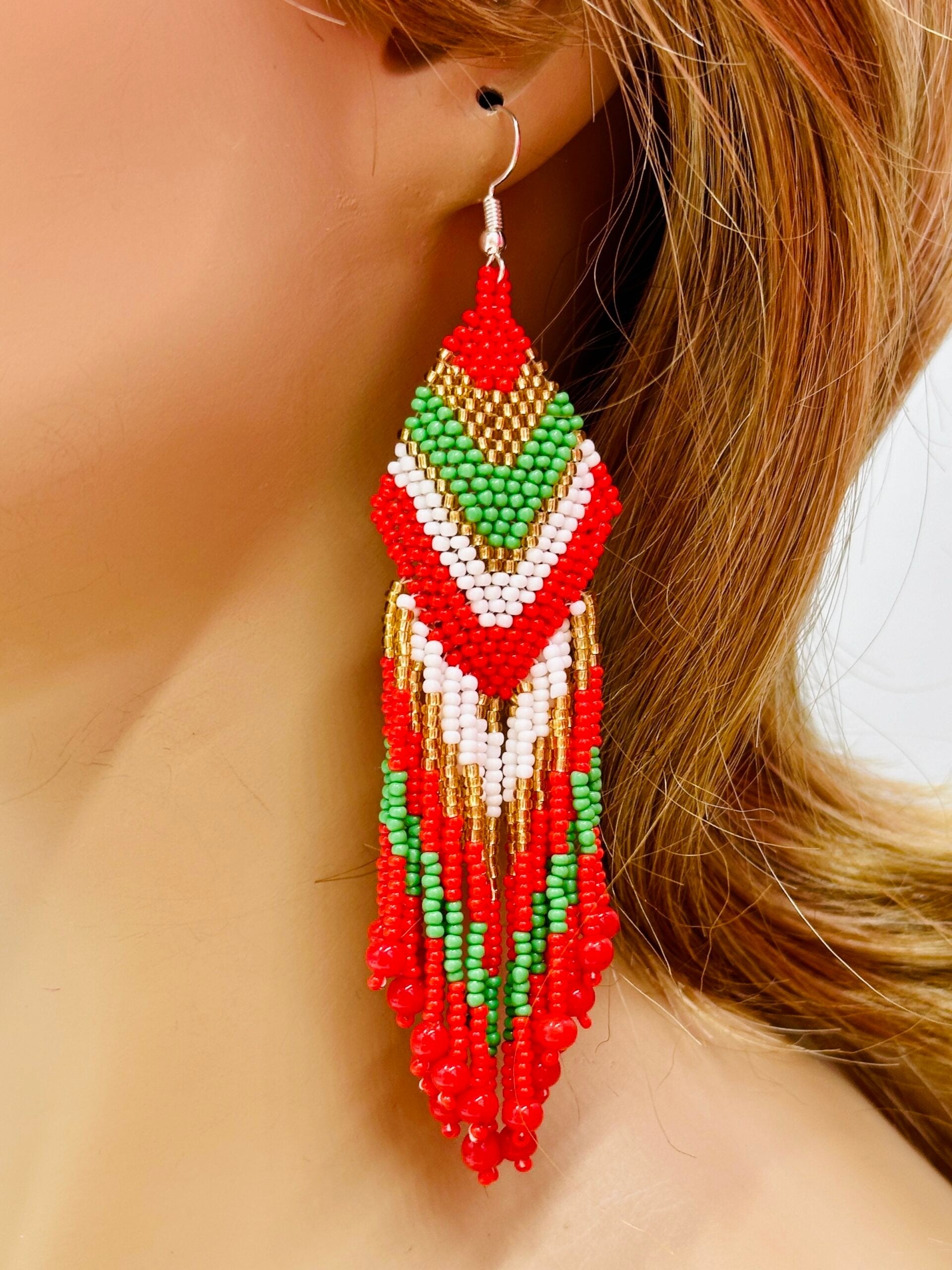 These handmade beaded drop dangle hook fringe earrings are a beautiful statement piece, crafted with premium Czech glass beads in size 11/0. Featuring a rich color palette of vibrant red, festive green, and shimmering gold, they capture the essence of holiday cheer and elegance. Measuring 4.5 inches in length and 1.2 inches in width, these earrings are designed to make a bold impact while remaining lightweight and comfortable for extended wear. The intricate Native-inspired fringe design brings a unique touch, making them perfect for holiday parties, Christmas gatherings, or simply adding festive flair to any outfit. Sure to get compliments!