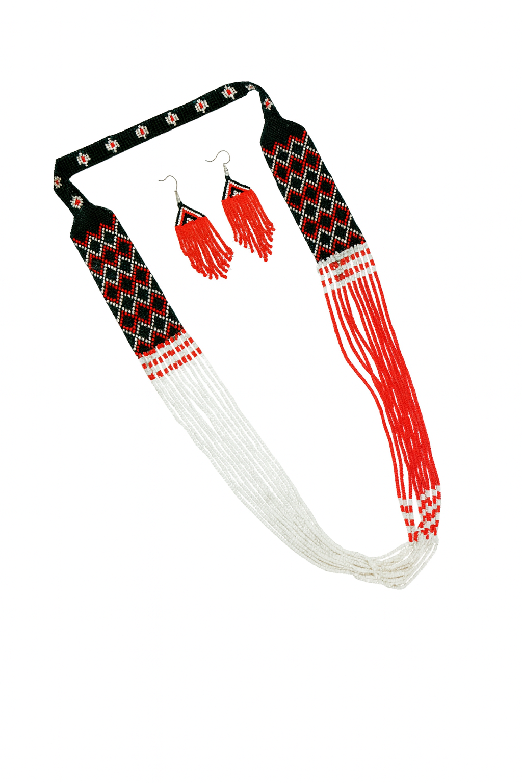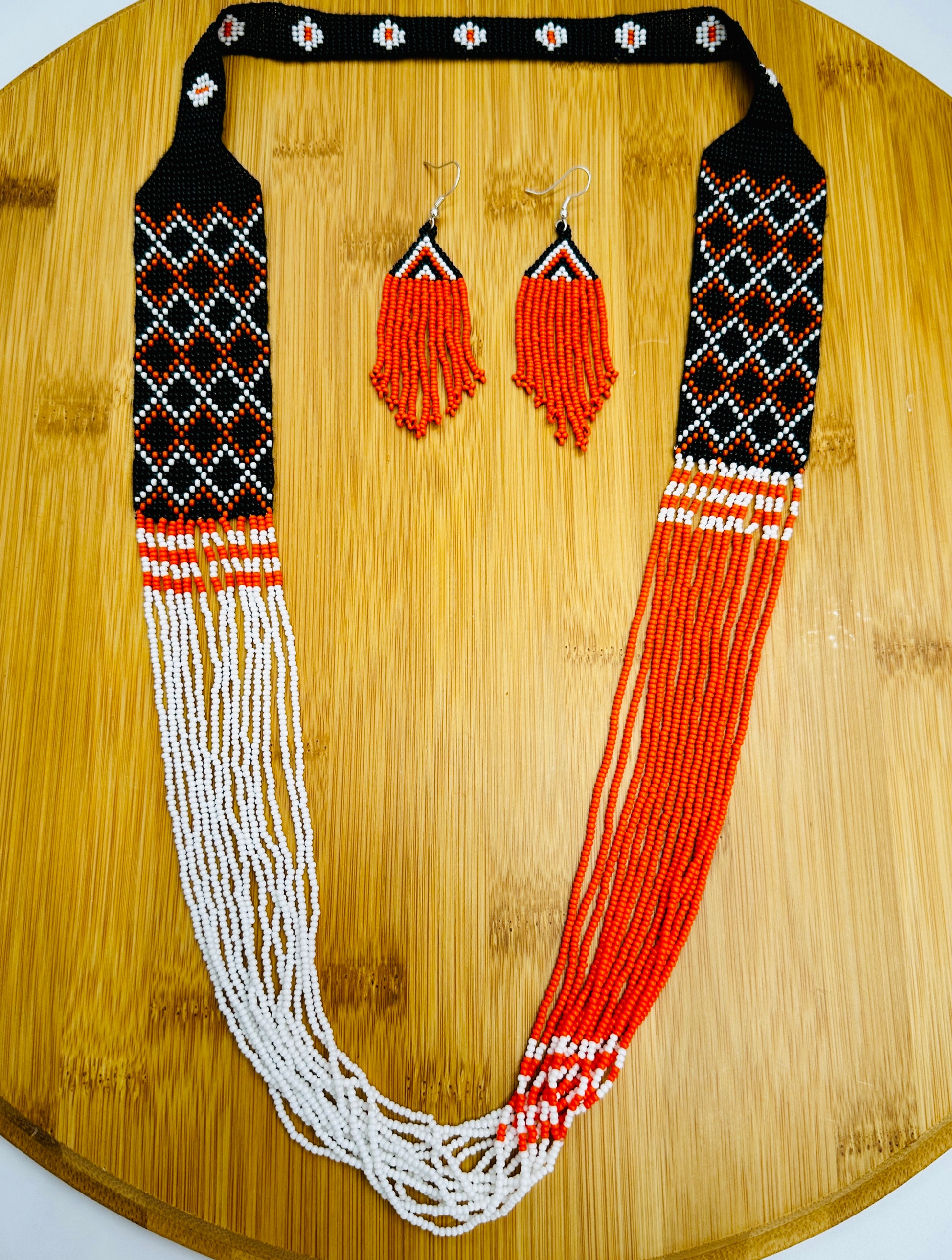 Make a statement with this stunning handmade beaded jewelry set. Featuring intricate diamond patterns in black, white, and orange, this long necklace with matching fringe earrings adds bold elegance to any outfit.