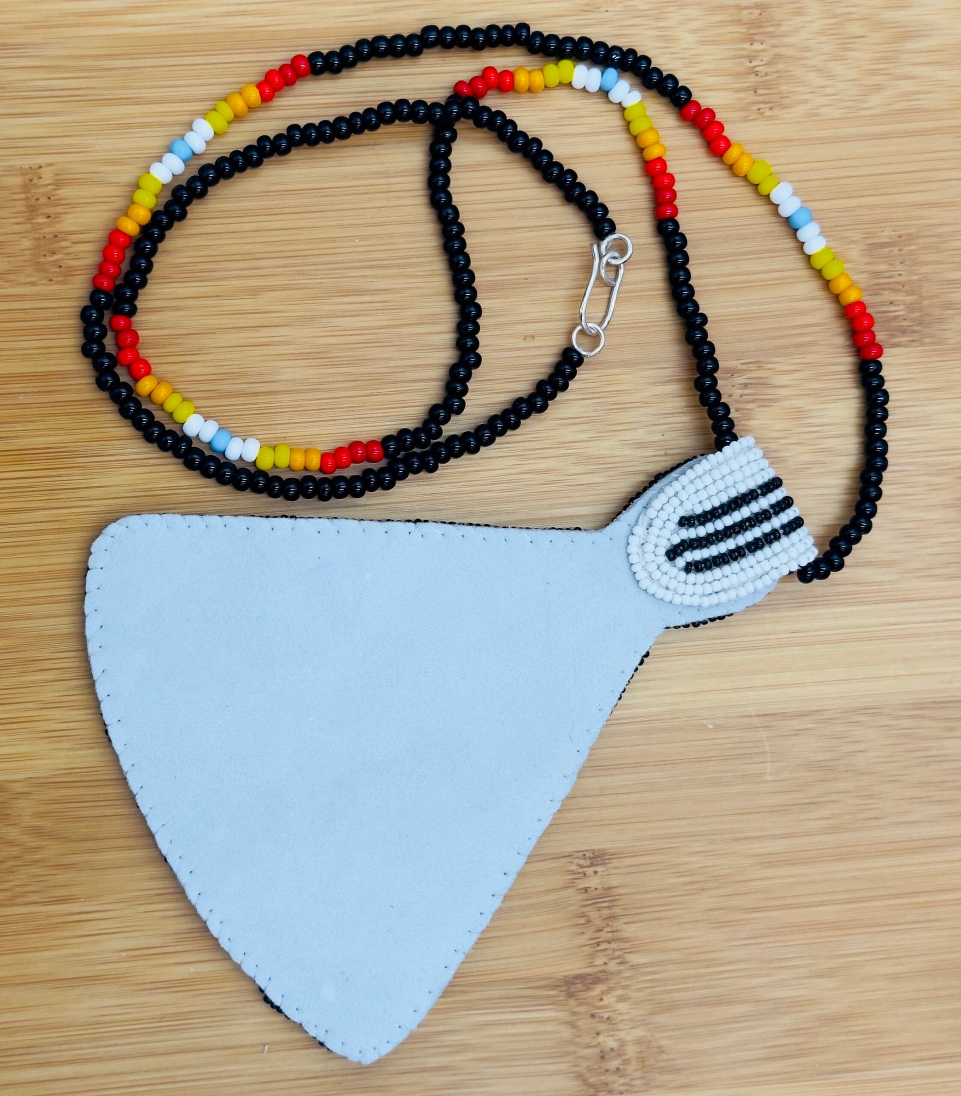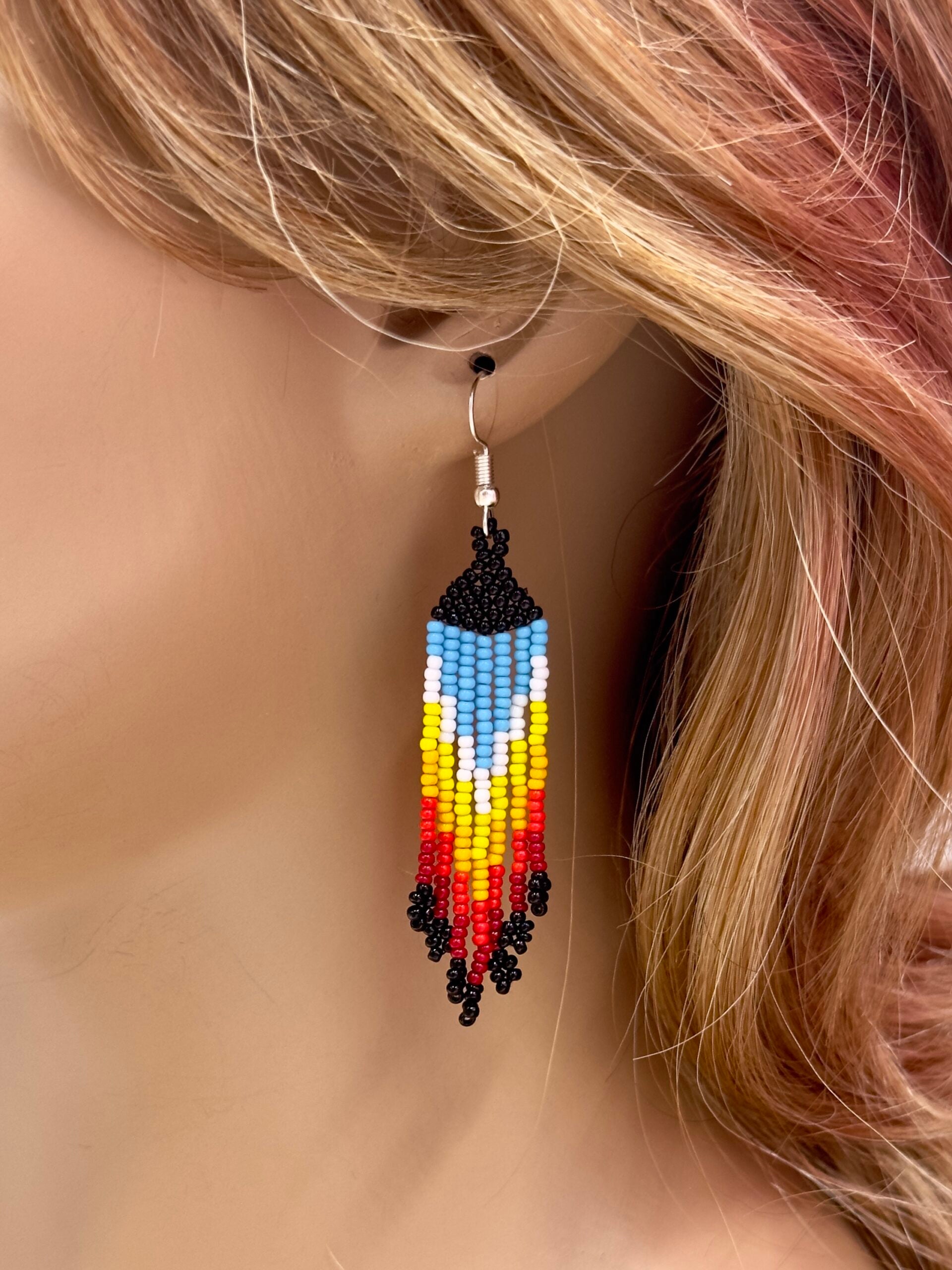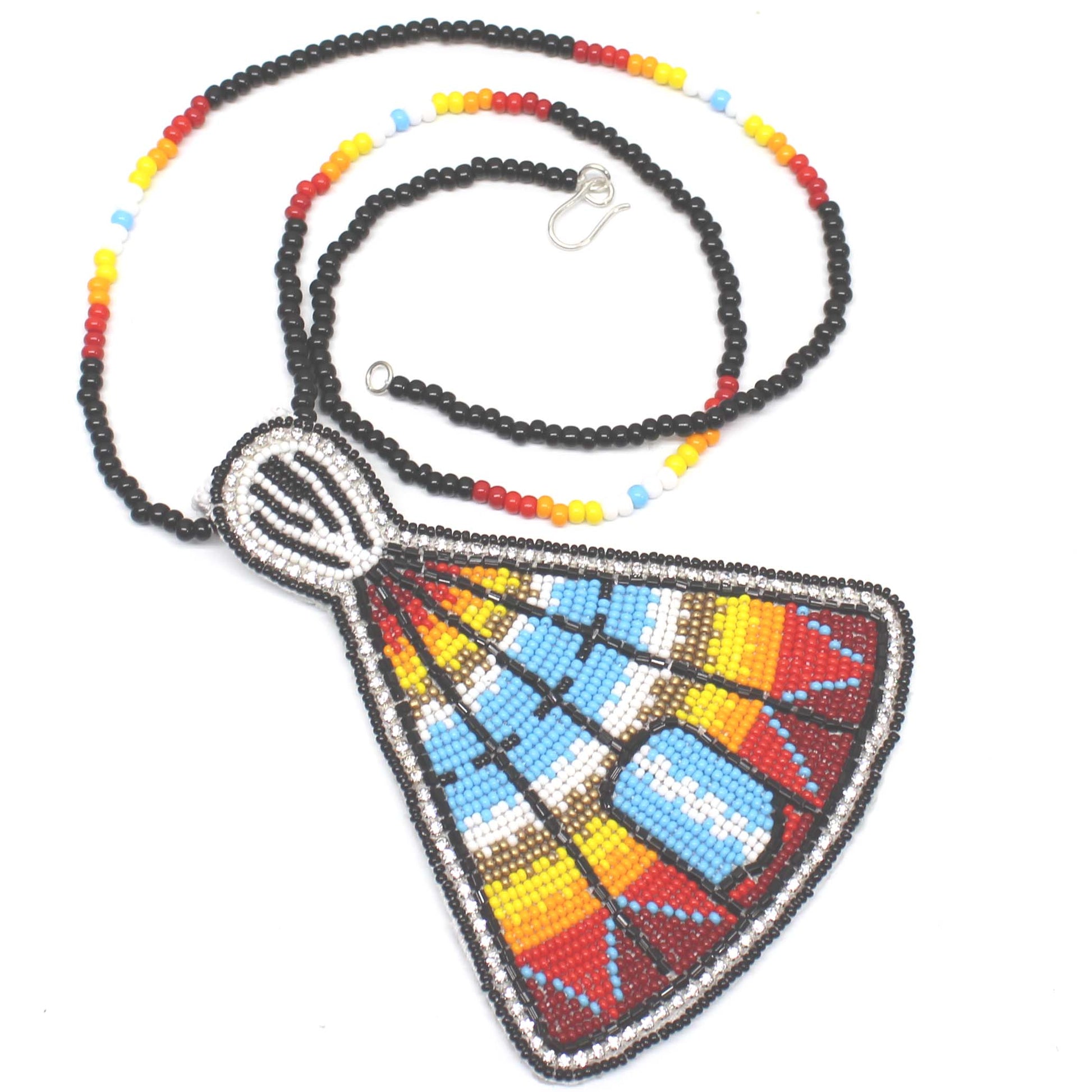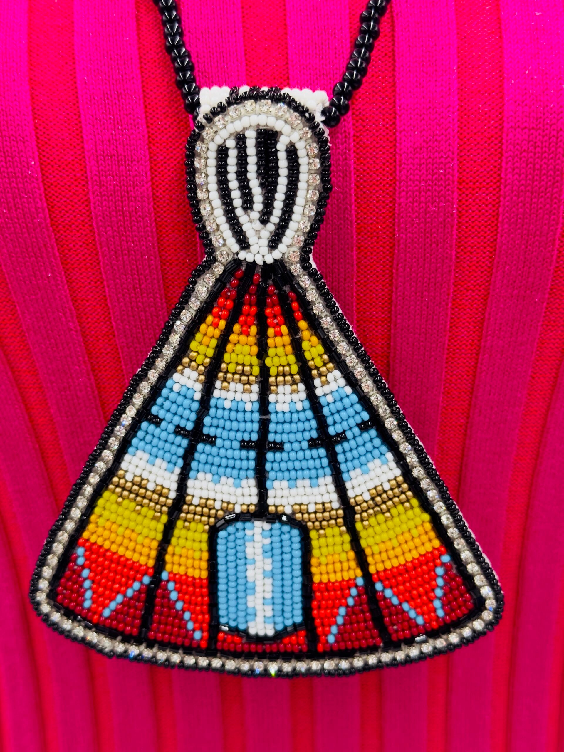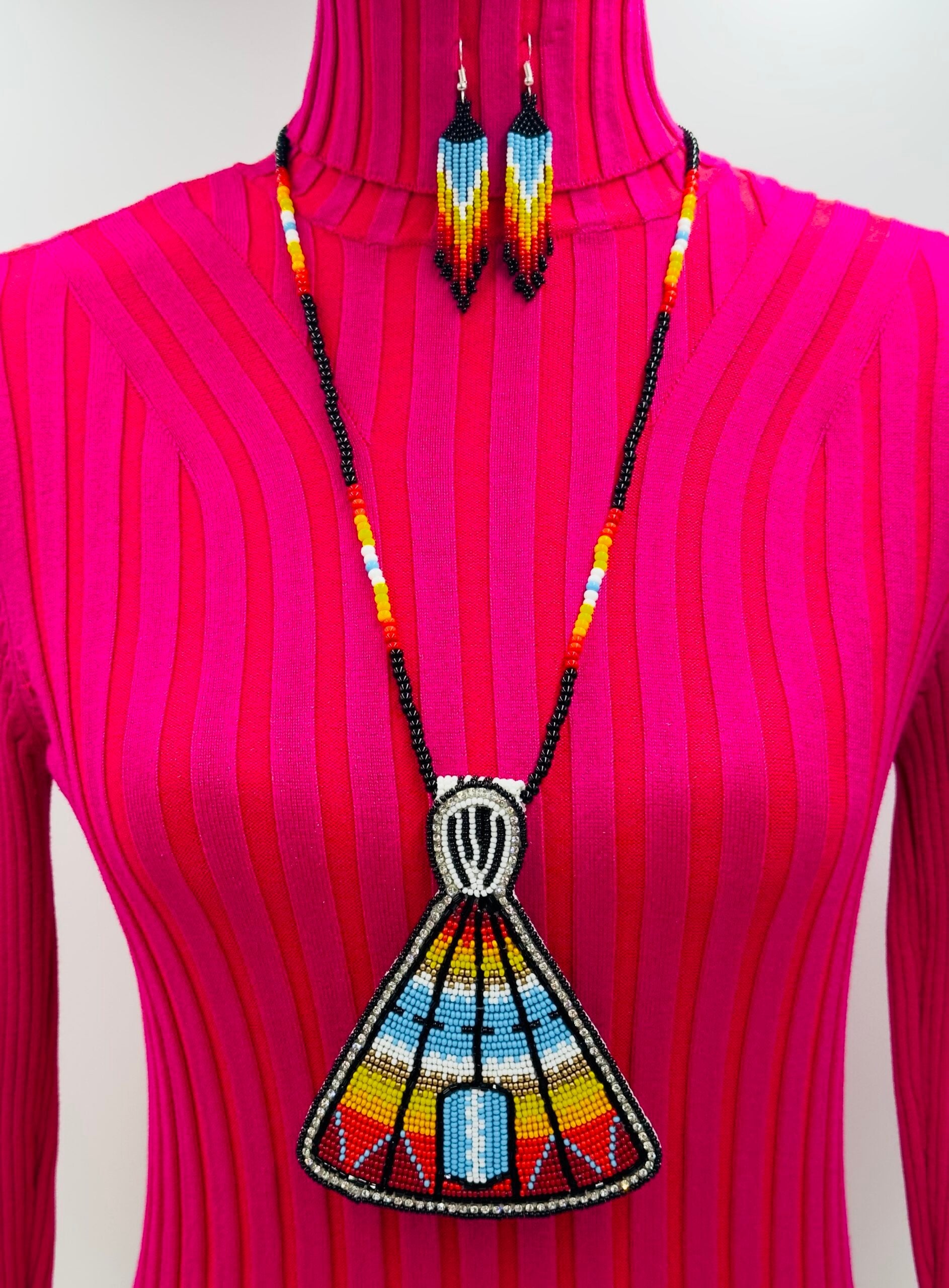 This exquisite handmade beaded Tepee pattern necklace set, showcases the artistry of beadwork using Premium Czech beads in size 11/0. The vibrant color palette features a harmonious blend of Black, Red, Cyan Blue, White Blue, Yellow and Silver Rhinestone creating a striking visual appeal.