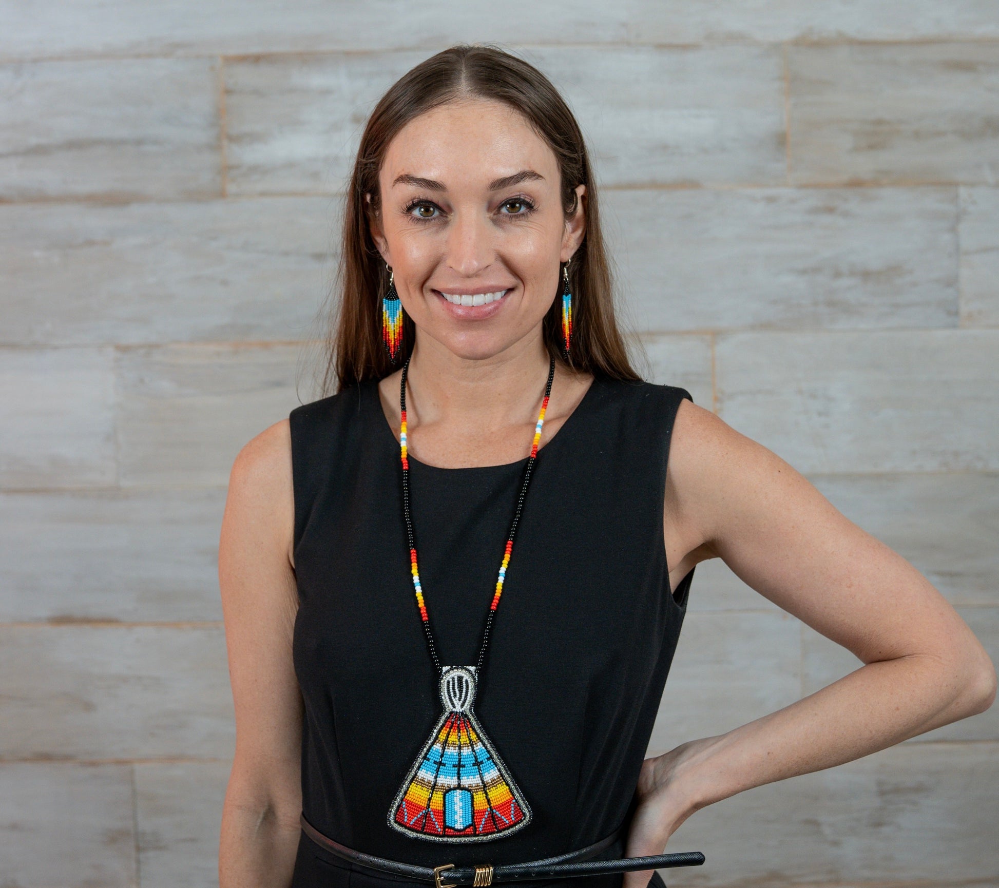 The necklace, with a 17-inch drop, is adorned with intricate Tepee pattern that lead to a stunning medallion pendant, measuring 5 inches long and 4 inch wide. The pendant's back is lined with soft suede leather, ensuring a comfortable fit against the skin.