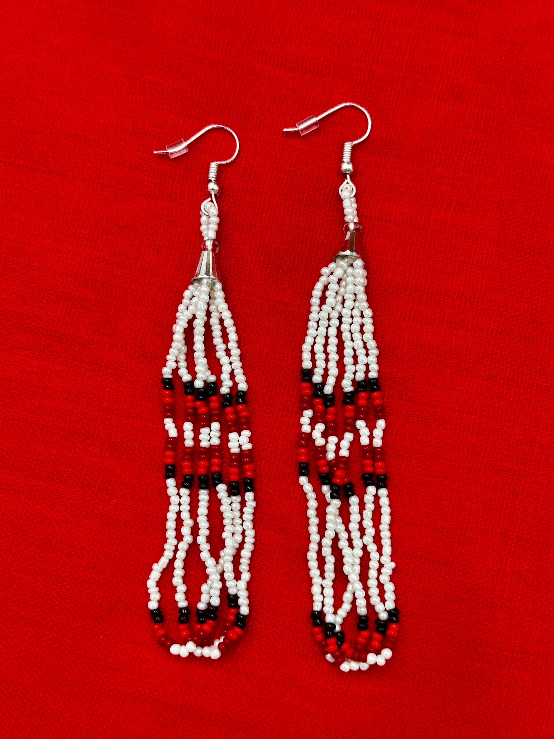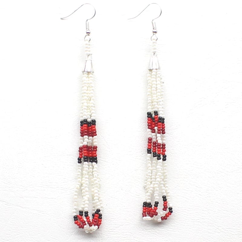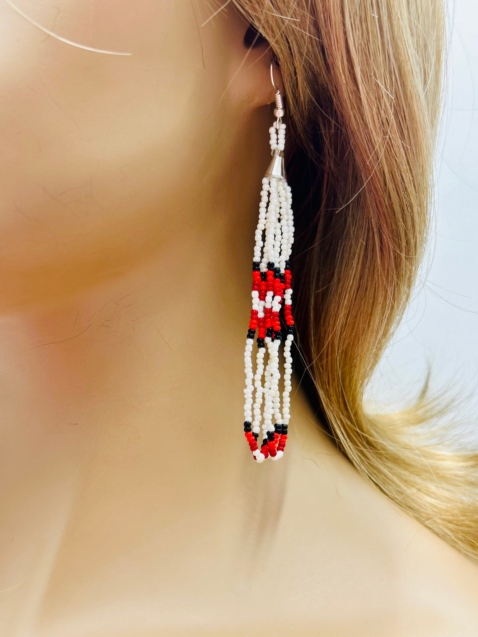 Handmade beaded White Red long hook dangle earrings made with Czech beads size 11/0