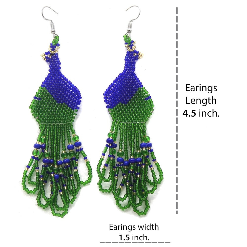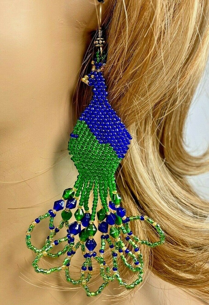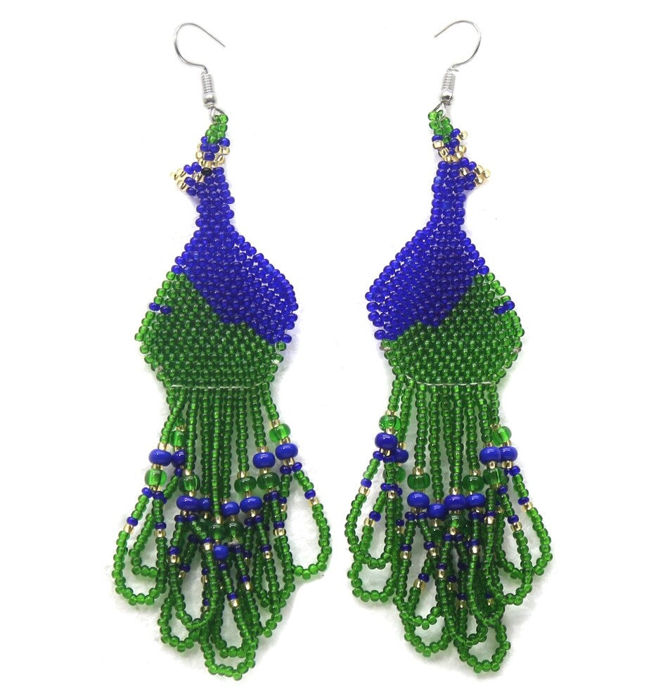 Handmade Blue Green Beaded Native Style Peacock Hook Earrings