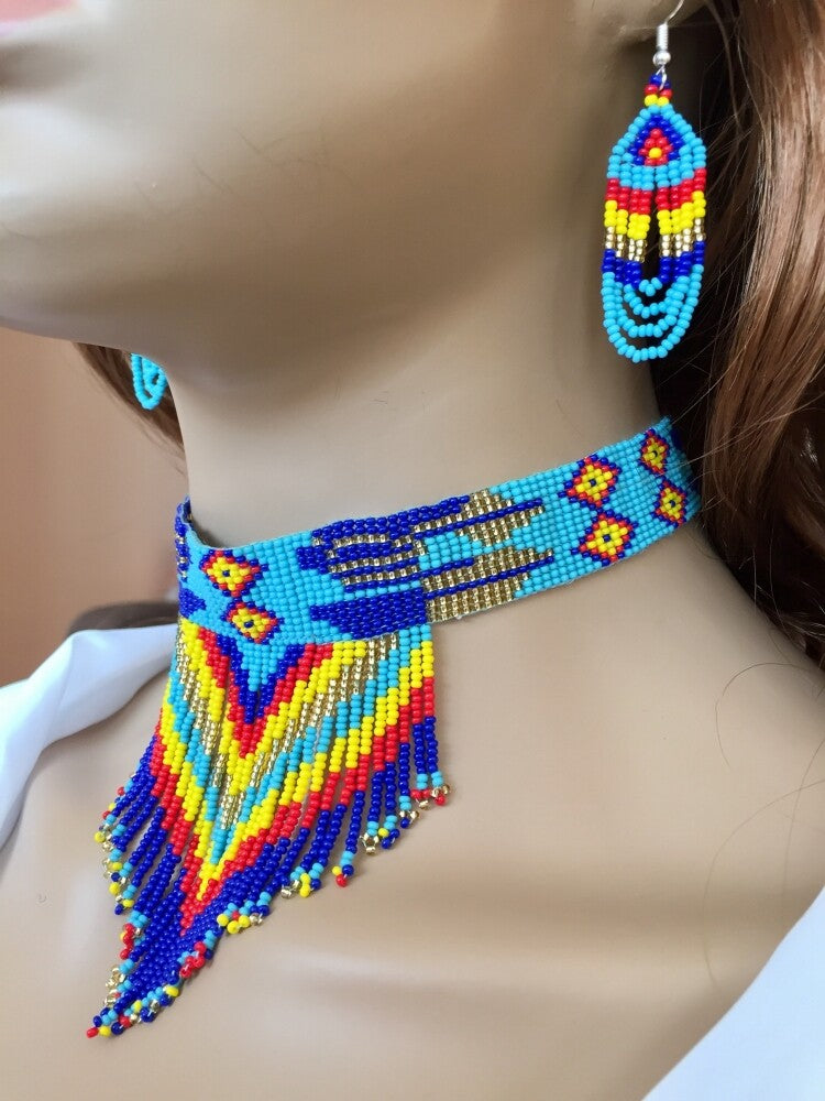 Vibrant Blue Multi-Color Beaded Choker Necklace Earrings Set