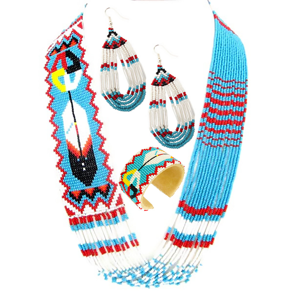 Add a vibrant pop of color to your outfit with this stunning Handmade Beaded Feather Design Layered Necklace Earrings bracelet Set. Handcrafted with attention to detail, this set features a unique feather pattern in bold Cyan Blue, White, Red, Black, and Yellow hues. The necklace is adjustable from 26.5 to 30.2 inches, making it perfect for any neckline, while the earrings provide a fun and fashionable finishing touch with their hook findings. With a total weight of 72.0 grams, this set is lightweight and comfortable to wear all day long.