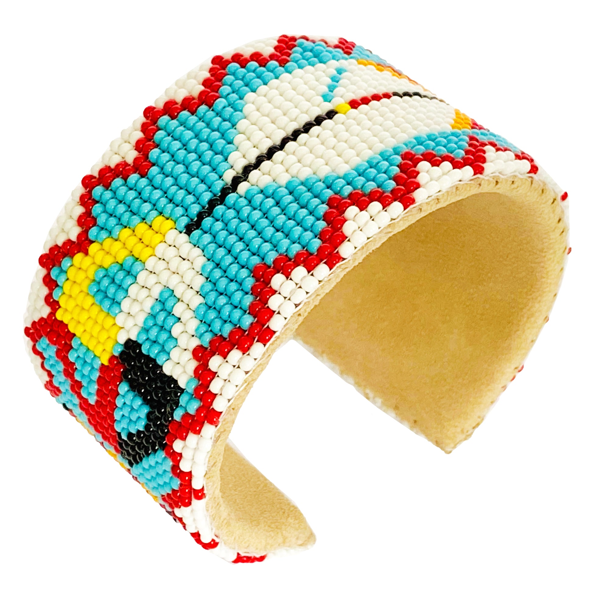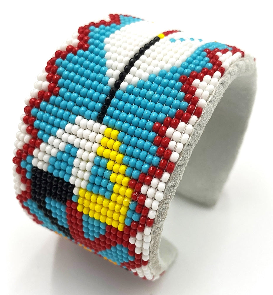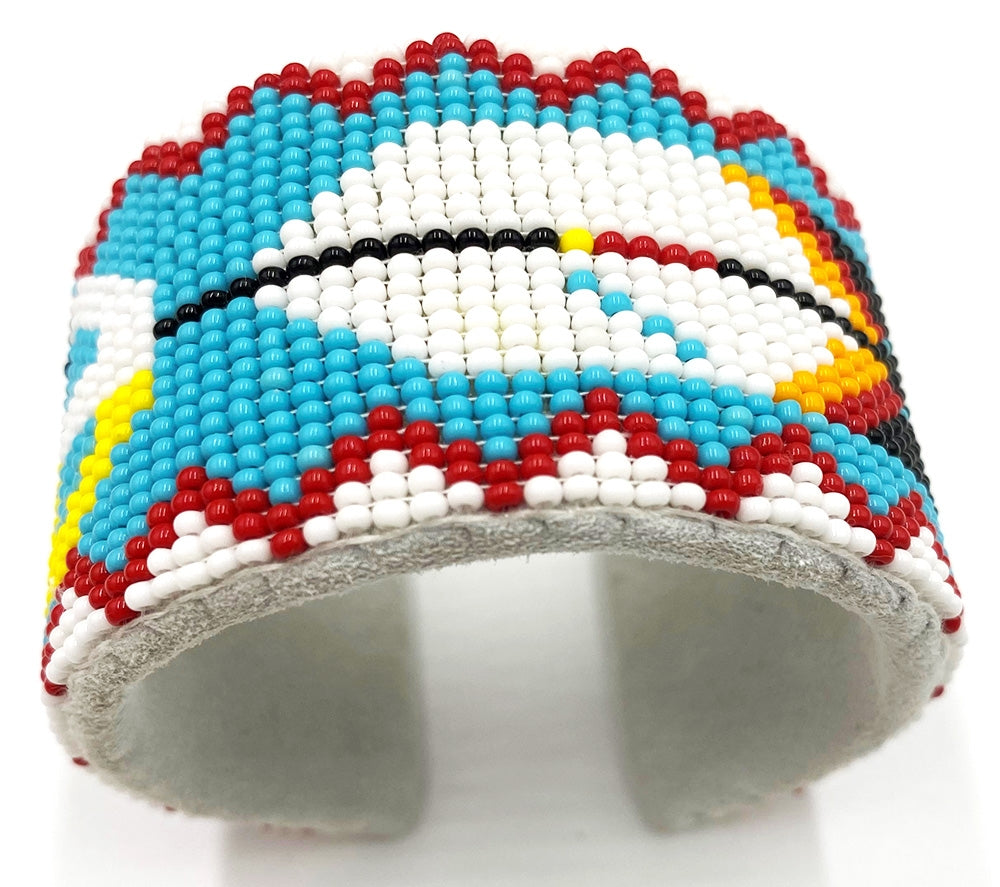 This unique handmade beaded cuff leather bracelet is a stunning accessory that exudes style and craftsmanship. It features a beautiful feather design in vibrant cyan blue, white, red, and black colors. Made using small 11/0 Czech seed beads and suede leather with aluminum inside, this bracelet is 6.5 inches in length and 1.5 inches in width. The intricate beadwork is meticulously crafted on a loom, resulting in a one-of-a-kind piece that adds a touch of elegance to any outfit.