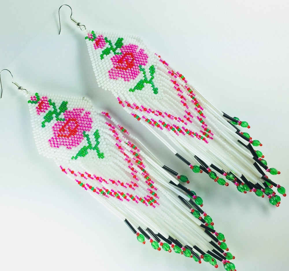 These stunning long Rose flower design beaded fringe earrings are handmade beautifully by skilled artisans. The colors of the beads used are White, Pink and Green. The metal hook is silver polished and good for sensitive skin. These Statement earrings are handmade beautifully by skilled artisans. It is nickel free. These handmade Native American inspired beaded jewelry pieces which are a work of excellent craftmanship are made by women who live in villages and are carrying this age-old tradition of beading. These tiny glass Czech beads are laid in bowls and strung into threading. Each piece of jewelry is labor intensive. Please see the picture for details. Please feel free to contact us if you have any questions. Customer satisfaction is our priority above all.