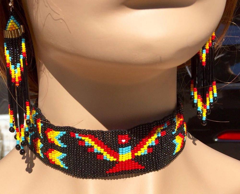 Handmade Native Inspired Black Multicolored Choker Necklace Earrings Set