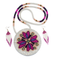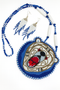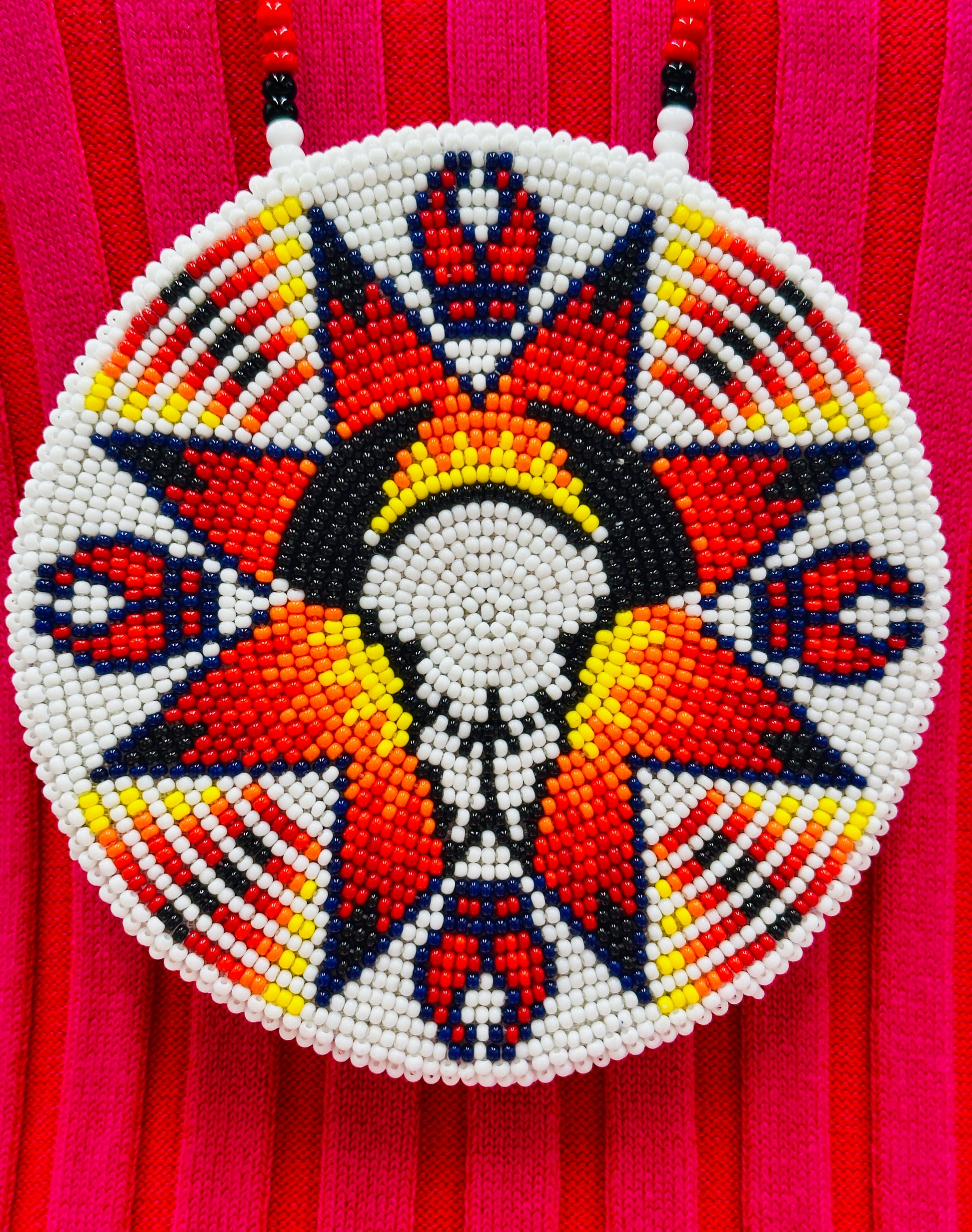 - Statement Pendant – Large round pendant, about 4 inches in diameter, featuring a radiant starburst pattern with detailed beadwork. Drops about 14”from shoulder. Suede leather in the back of the pendant for soft feel.