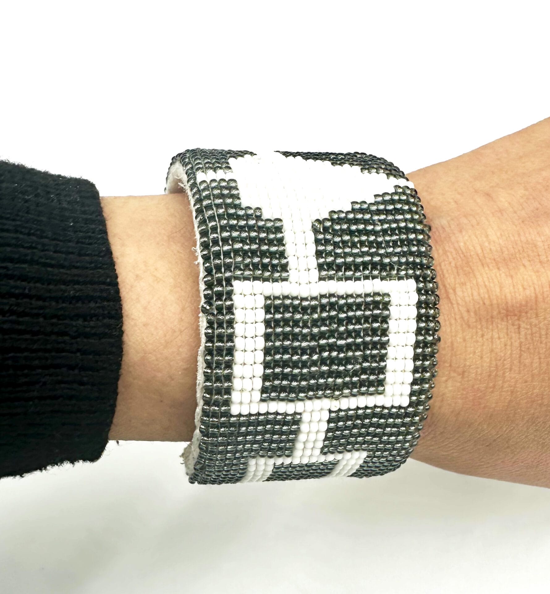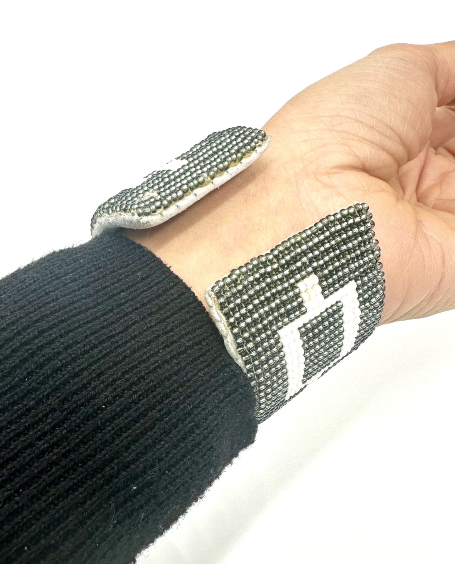 Handcrafted Iris Grey White Seed Beads Hiawatha Beadwork Beaded Cuff Adjustable Bracelet Leather