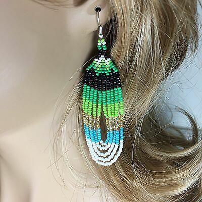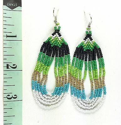 Native Inspired Style Handcrafted New Green White Gold Beaded Hook Earrings