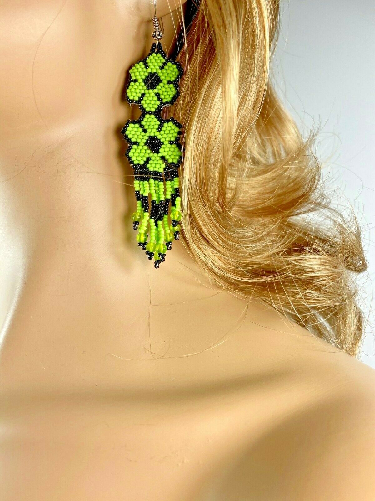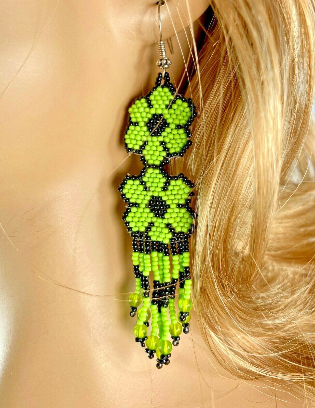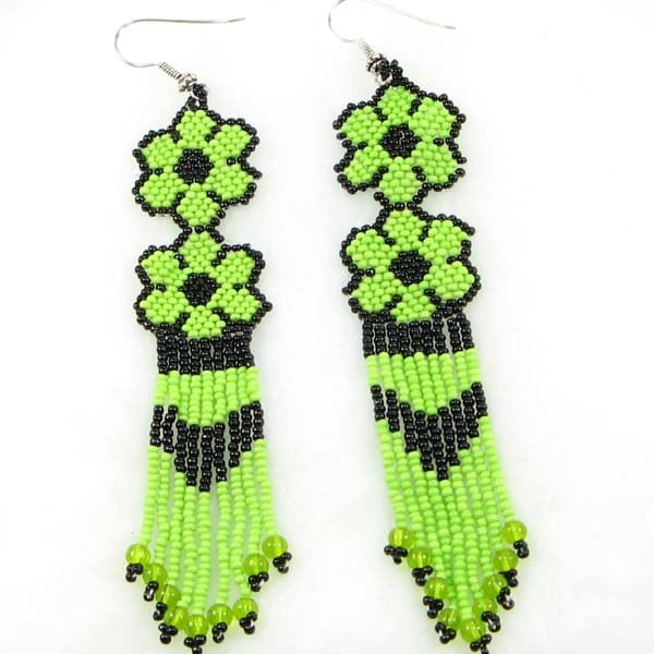 Native Style Ethnic Black Green Flower Beaded Handmade Hook Earrings E10/1