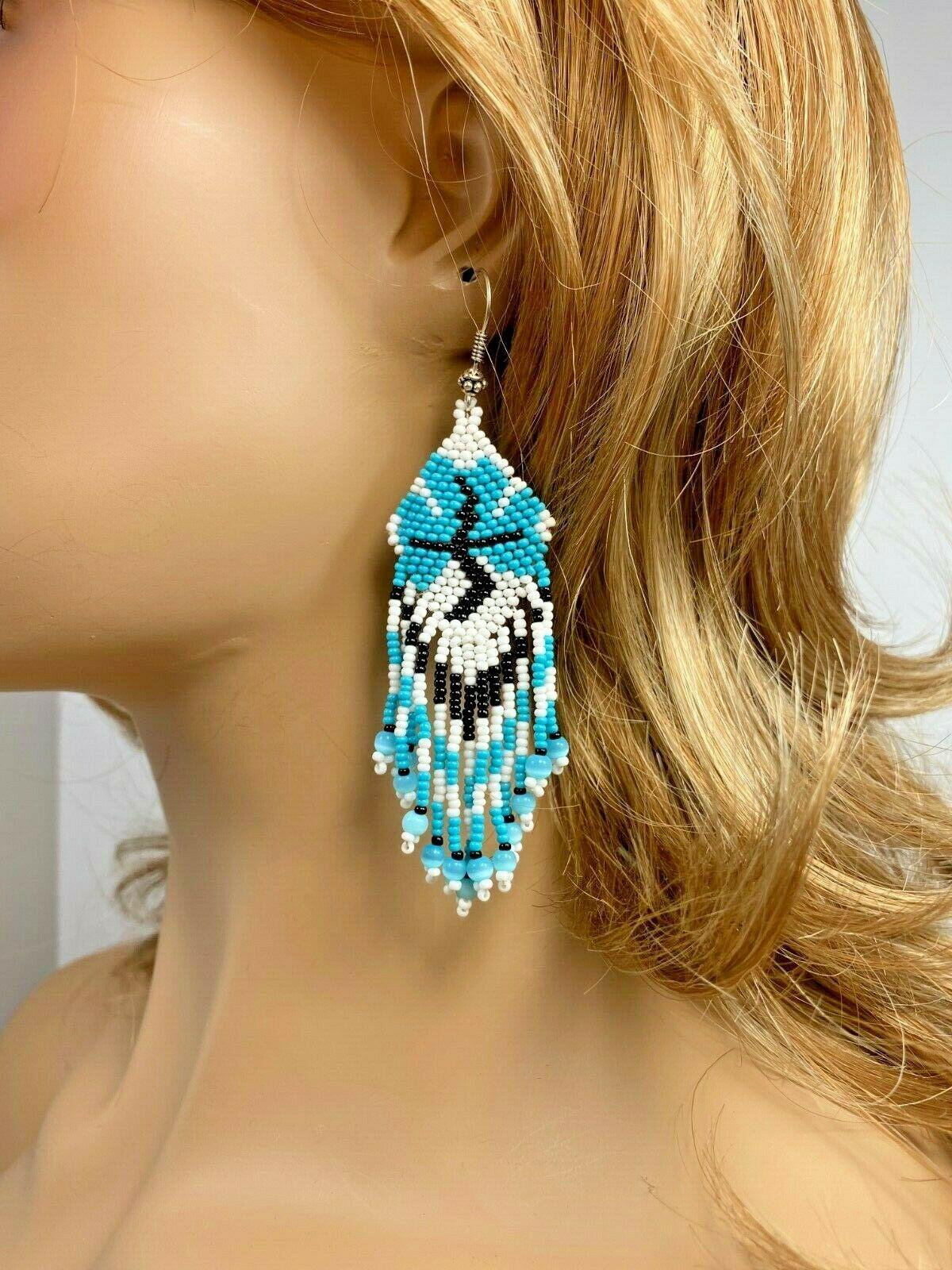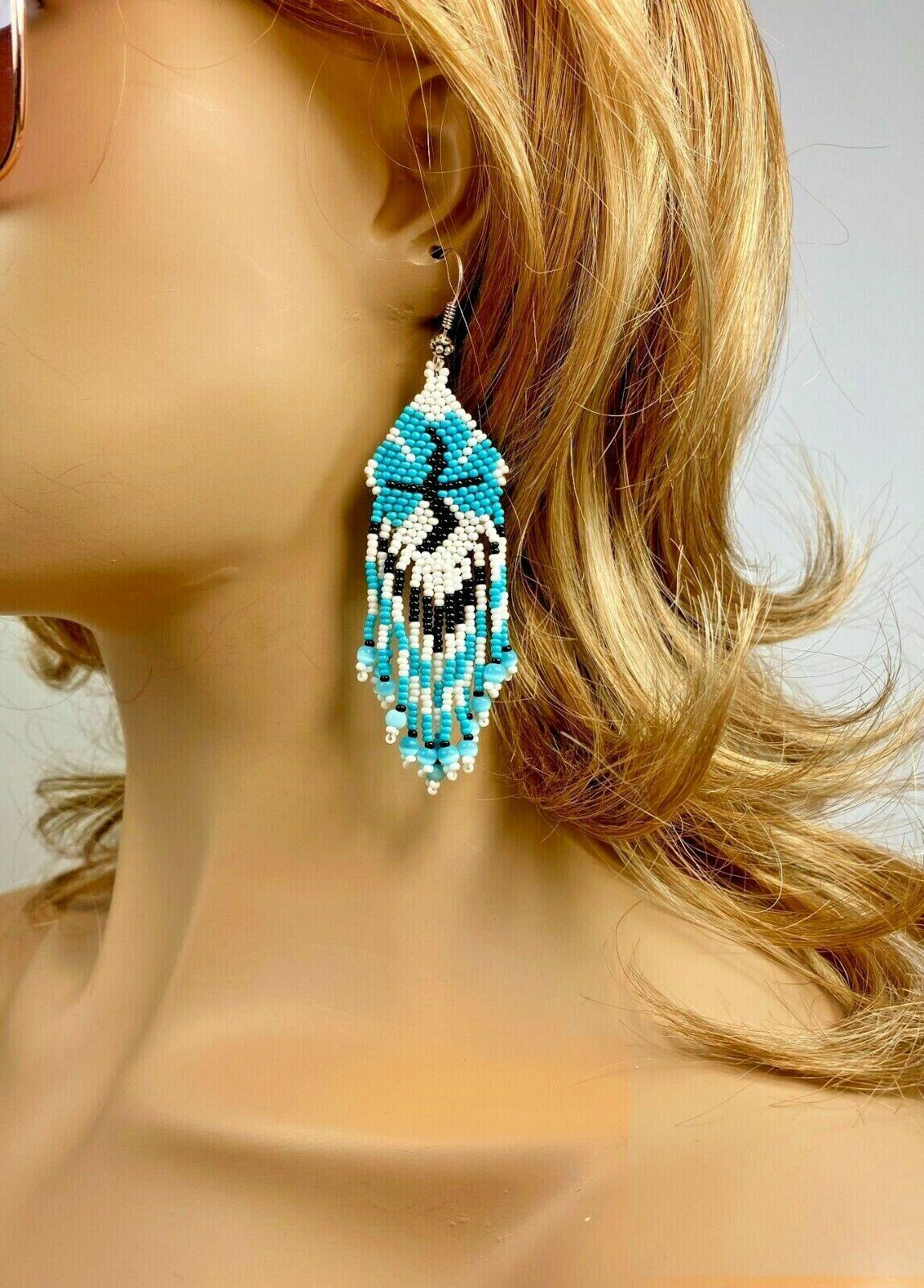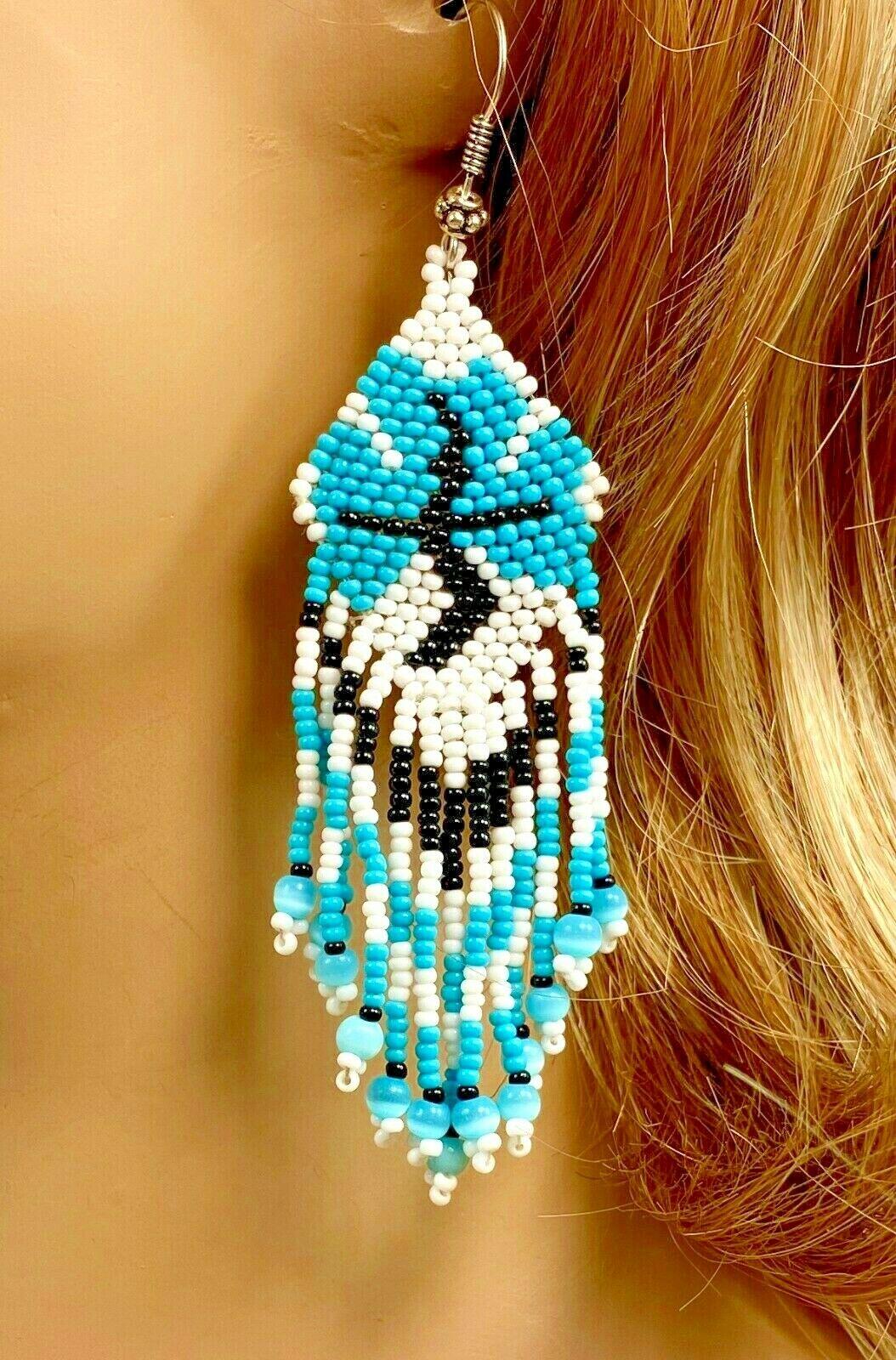 Native Style Ethnic Blue White Seed Beaded Handmade Chandelier Earrings E11/1
