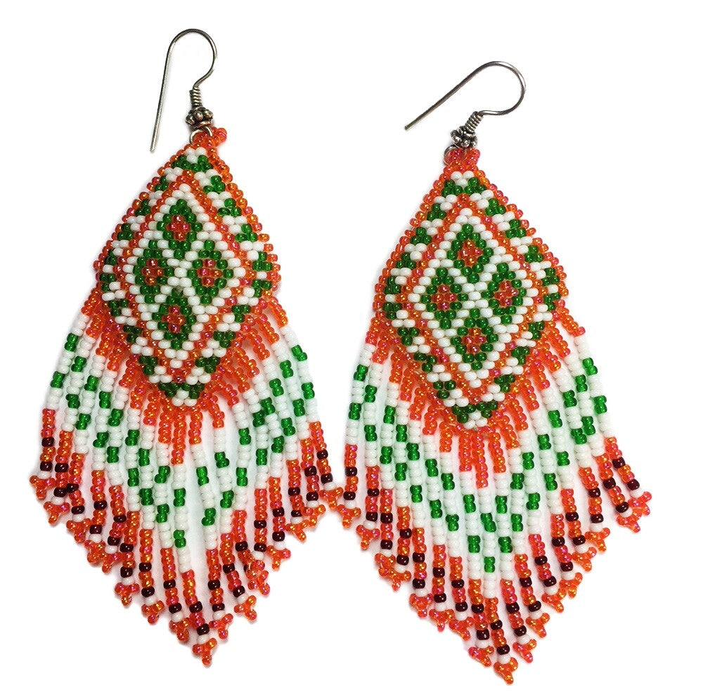 Vibrant Orange, Green, and White Geometric Beaded Earrings