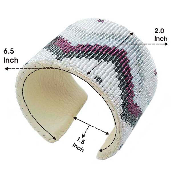 Add a touch of edgy sophistication to your outfit with this Purple Grey White Adjustable Handmade Leather Hard Cuff Bracelet. Handcrafted on a loom using small 11/0 Czech seed beads, this cuff bracelet features a unique design in vibrant colors. The adjustable fit ensures a comfortable wear, while the aluminum inside adds durability. With a weight of 73.0 grams, a length of 8 inches, and a maximum width of 2 inches, this bracelet is a statement piece that will elevate any look.
