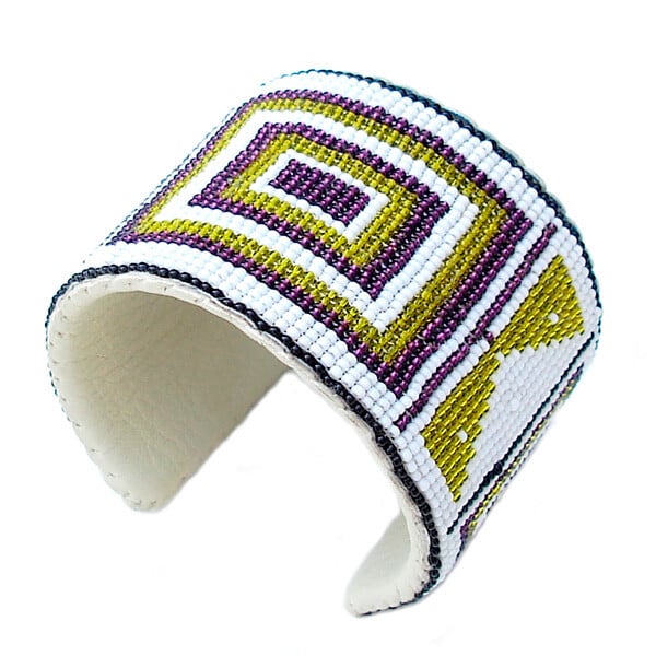 Handmade White Green Purple Beaded Bracelet with Suede Back - Adjustable Length and Bold Width