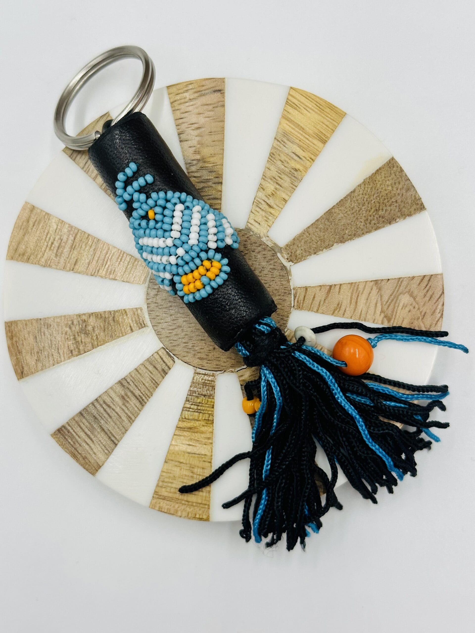 These keyrings are a testament to the art of beadwork, featuring intricate Native style patterns painstakingly created using tiny, vibrant seed beads. keyrings have blending geometric designs and earthy colors that evoke a sense of tradition and spirituality.